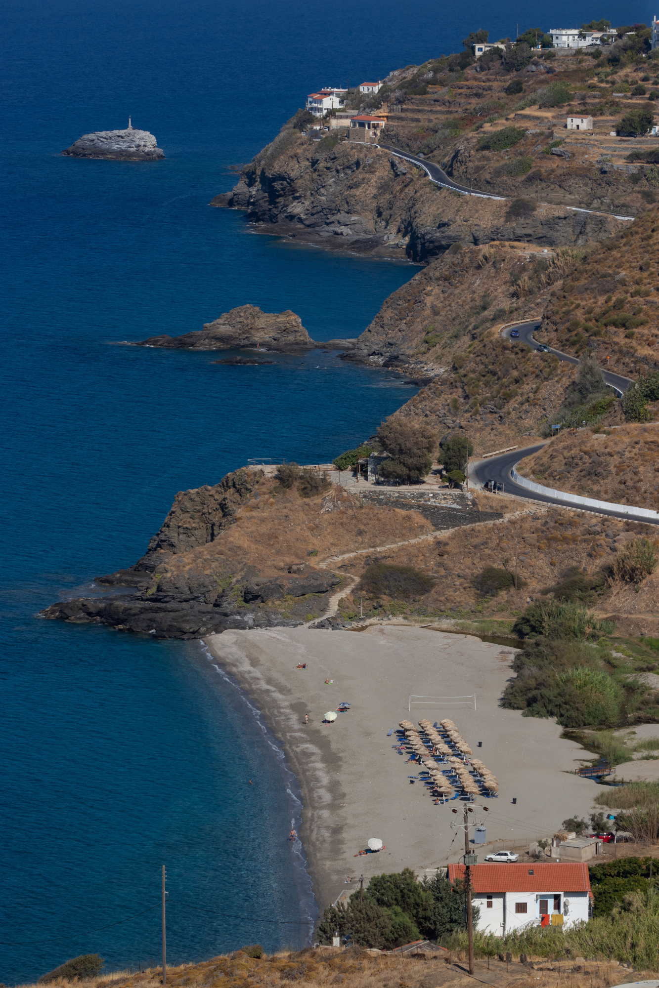Είναι μία από τις πιο ιδιαίτερες παραλίες του νησιού καθώς σε αυτήν καταλήγει ένα ποταμάκι και πίσω της υπάρχει πυκνή βλάστηση. Φημίζεται για τα θαλάσσια ρεύματα και η αλήθεια είναι ότι χρειάζεται προσοχή και αν αντιληφθείτε ισχυρά ρεύματα να παραμείνετε κοντά στην ακτή. Παρ’ όλα αυτά, είναι μια πανέμορφη παραλία με χοντρή άμμο και ψιλό βότσαλο, τιρκουάζ νερά και βράχια δεξιά και αριστερά. Τα νερά βαθαίνουν απότομα και είναι διάφανα. Δεν είναι οργανωμένη παραλία, αλλά από πάνω υπάρχει μια ταβέρνα που σερβίρει και καφέδες.