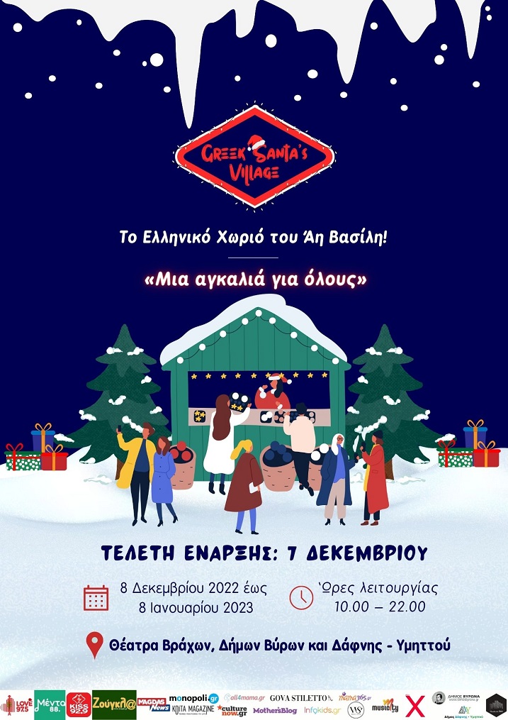 Ήχοι από κουδουνάκια ταράνδων, πολύχρωμες στολές ξωτικών, γιορτινές λιχουδιές και ζεστή σοκολάτα μοσχομυρίζουν παντού, χριστουγεννιάτικα λαμπάκια αναβοσβήνουν και οι ήχοι του «Jingle Bells» πλημμυρίζουν τον χώρο απ’ άκρη σε άκρη. Αυτά τα Χριστούγεννα δεν χρειάζεται να ταξιδέψετε για να επισκεφθείτε μία χριστουγεννιάτικη αγορά φτιαγμένη στα πρότυπα των κεντροευρωπαϊκών χωρών, αφού στο Δήμο Βύρωνα, συγκεκριμένα μέσα στο Θέατρο Βράχων, θα λειτουργήσει το πρώτο Ελληνικό Χωριό του Αη Βασίλη (Greek Santa’s Village), με μία μεγάλη σειρά καλλιτεχνικών δρώμενων για μικρούς και μεγάλους.