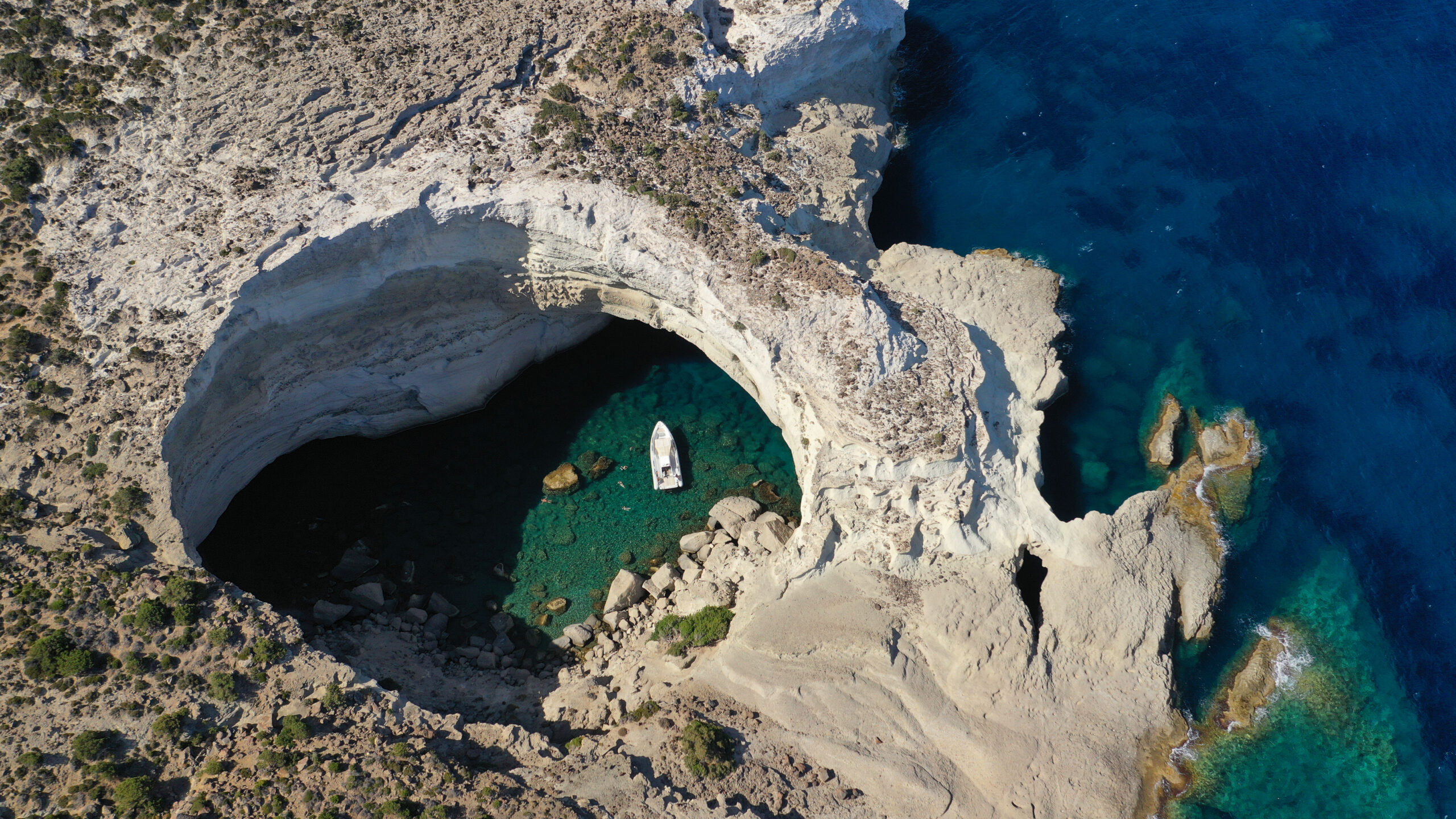 Το νησί της Μήλου είναι γεμάτο μοναδικούς γεωλογικούς σχηματισμούς. Από το Σαρακίνικο μέχρι το Κλέφτικο, τον Γέροντα και τον Παπάφραγκα, η Μήλος είναι από αυτές τις περιπτώσεις που δεν ξέρεις που να πρωτοπάς για μπάνιο. Στην παραλία της Συκιάς λοιπόν, υπάρχει ένα μεγάλο σπήλαιο που όμως το μεγαλύτερο μέρος της οροφής του έχει καταρρεύσει δημιουργώντας έτσι μια απαράμιλλης ομορφιάς εικόνα. Μπαίνοντας από τη μικρή είσοδο με το φουσκωτό – μεγάλα σκάφη δεν χωράνε – θα σας μαγέψουν τα λευκά ψηλά βράχια, τα υπέροχα νερά αλλά και το γεγονός ότι ενώ είστε ουσιαστικά σε μια σπηλιά, βλέπετε τον ουρανό. Στη μια πλευρά της μάλιστα υπάρχει και μια μικρή παραλία όπου μπορείτε να απλώσετε την πετσετούλα σας και να απολαύσετε αυτό το μοναδικό θέαμα.