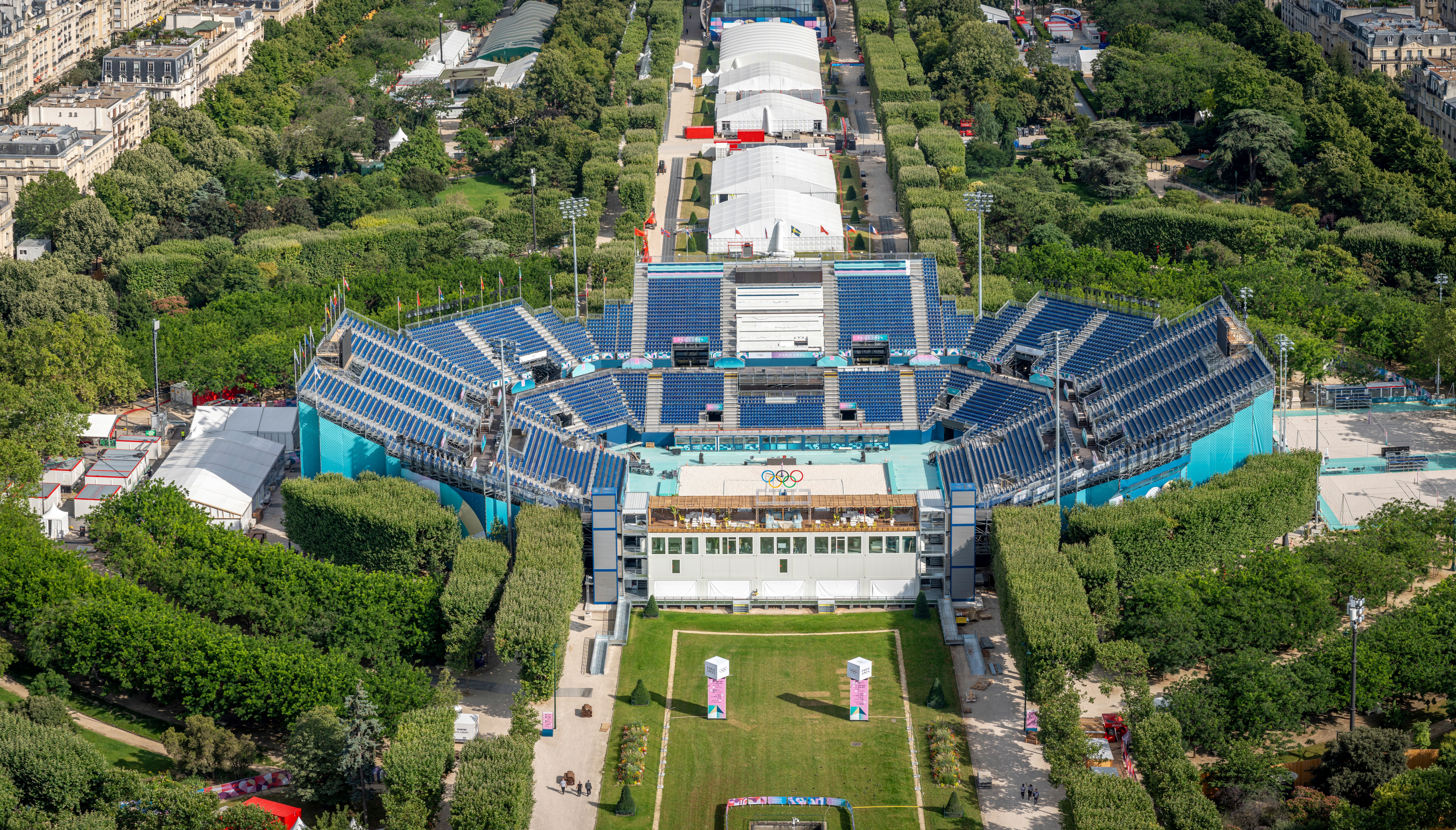 Το beach volley και το ανδρικό ποδόσφαιρο τυφλών θα διεξαχθούν σε ένα προσωρινό υπαίθριο στάδιο, το οποίο θα στηθεί στο Parc du Champ, δίπλα στο εμβληματικότερο αξιοθέατο του Παρισιού, τον Πύργο του Άιφελ. Ανάμεσα σε σουτ και σερβίς, οι περίπου 12.000 θεατές του σταδίου θα μπορούν να απολαύσουν την εικόνα του Πύργου. Στέκει στη θέση του από το 1889 και για αρκετές δεκαετίες υπήρξε το ψηλότερο κτήριο του κόσμου (330 μέτρα ύψος).