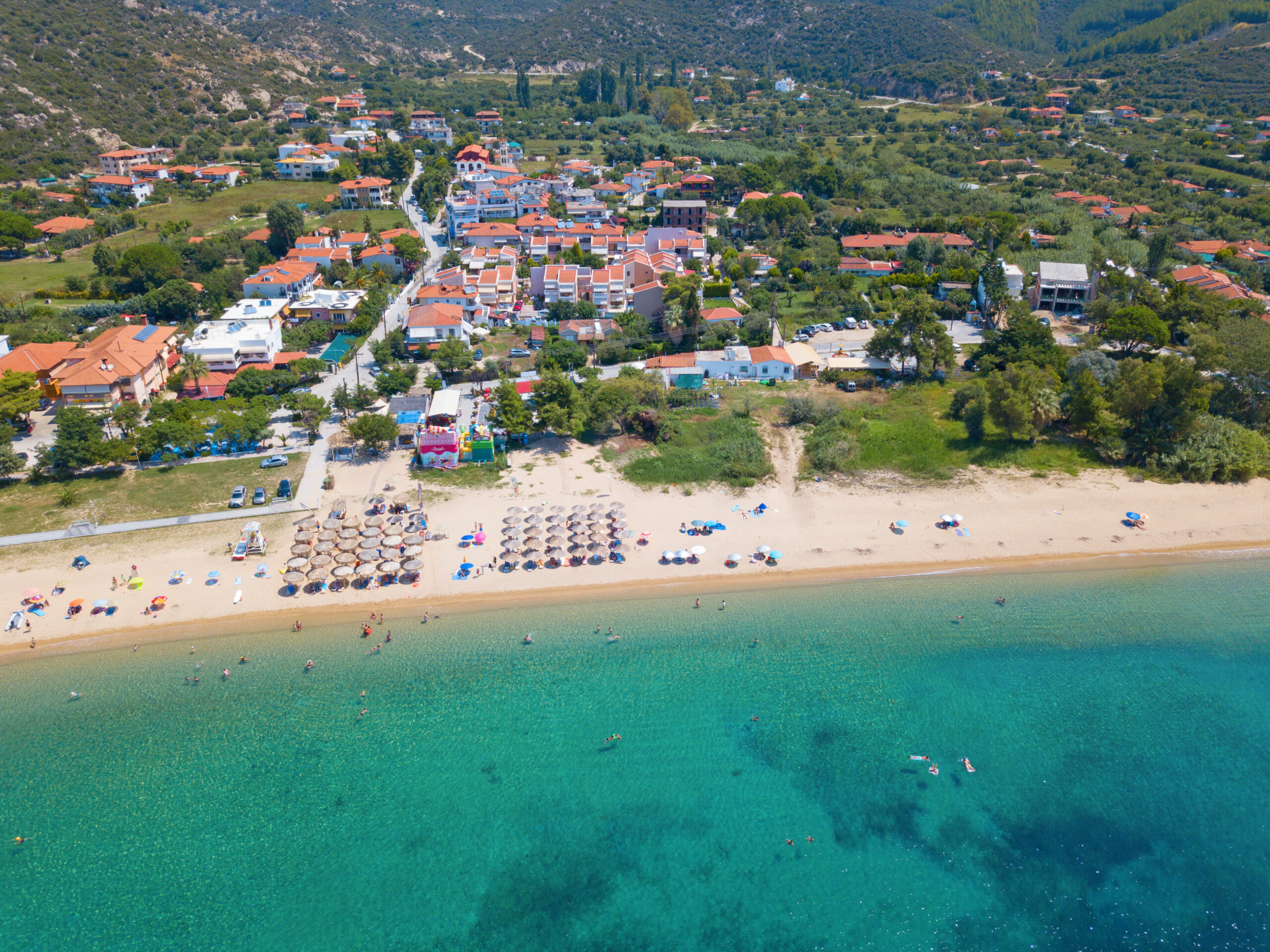 Εντυπωσιακή παραλία, με κρυστάλλινα νερά. Βρίσκεται στο νοτιοδυτικό άκρο της Σιθωνίας και απέχει 19 σχεδόν χιλιόμετρα – νότια- από το Νέο Μαρμαρά. Με μεγάλο μήκος, που ξεπερνάει το ένα χιλιόμετρο, αρκετά πλατιά, με λευκή χοντρή άμμο και νερά που βαθαίνουν γρήγορα. Η μεγάλη της έκταση, εξασφαλίζει τηρουμένων των αναλογιών, συνθήκες χαλάρωσης αλλά και κατασκήνωσης για όποιον επιθυμεί πιο ανοργάνωτες καταστάσεις. Ένα μικρότερο μέρος της είναι οργανωμένο με ομπρέλες και ξαπλώστρες.