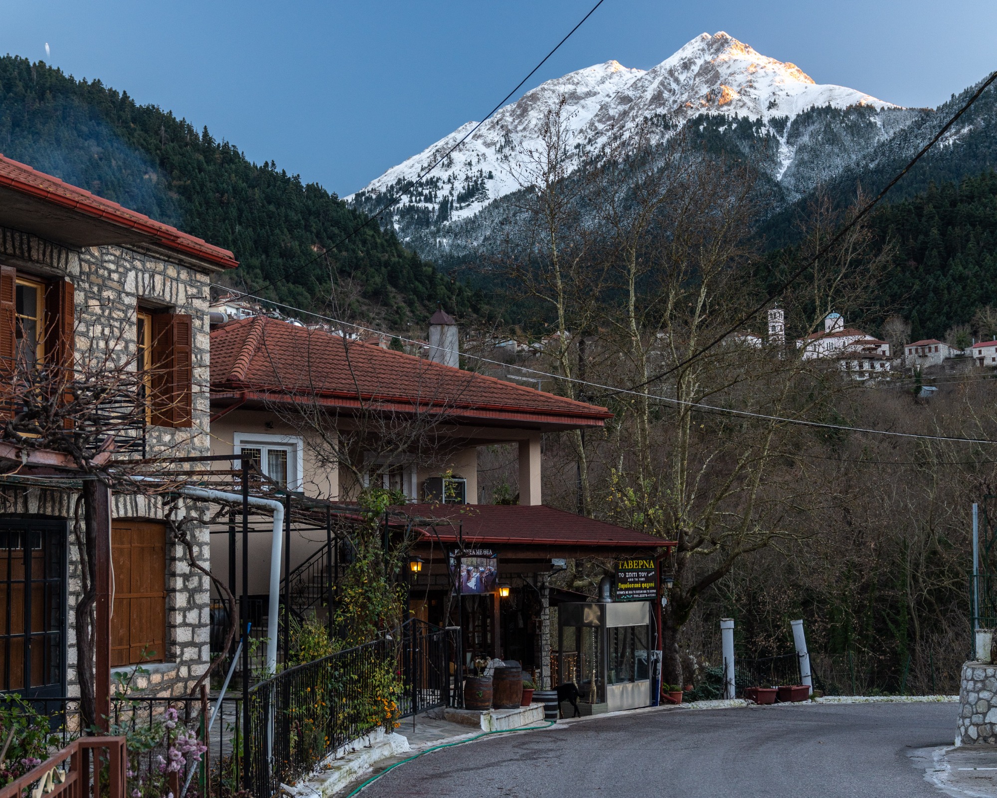 Η μεγάλη πλατεία με το πάντα ανοιχτό εστιατόριο-καφέ και τους ξεχωριστούς ξενώνες και η εκκλησία του Αγίου Αθανασίου, φτιάχνουν σκηνικό που ανακαλεί στη μνήμη ταινίες του Θόδωρου Αγγελόπουλου.
