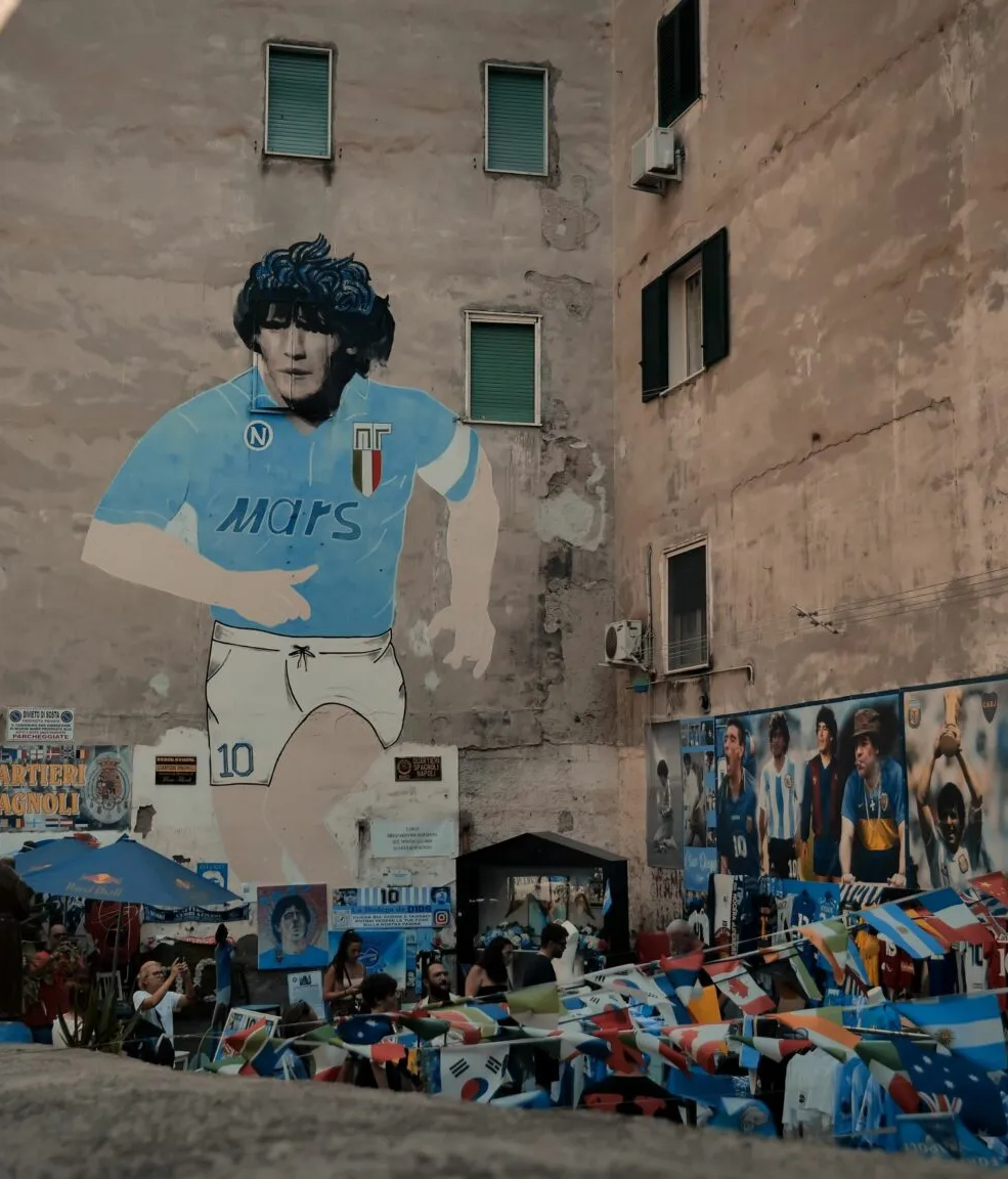 Ακόμα και αν δεν είστε φαν του ποδοσφαίρου η παρουσία του ομώνυμου συλλόγου και του Ντιέγκο Μαραντόνα είναι τόσο σημαντική και εμφανής στην πόλη που αξίζει μία μικρή βόλτα αφιερωμένη στα κατορθώματά του. Ειδικά, σε μία χρονιά όπως το 2023 που η Νάπολη επέστρεψε στην κορυφή του ιταλικού ποδοσφαίρου μετά από 33 ολόκληρα χρόνια. Σχεδόν σε όλη την πόλη θα δείτε δεκάδες γκράφιτι και murals αφιερωμένα στον Μαραντόνα και τους τωρινούς αστέρες της ομάδας. Αξίζουν μία επίσκεψη το Museo del Calcio που βρίσκεται μέσα στο στάδιο San Paolo. Στο μουσείο θα δείτε αναμνηστικά, τρόπαια και αντικείμενα που σχετίζονται με την ιστορία της Νάπολη, συμπεριλαμβανομένων εκθεμάτων αφιερωμένων στην εποχή του Μαραντόνα στον σύλλογο. Στην καρδιά της πόλης υπάρχει η Piazza Maradona, η πλατεία που είναι αφιερωμένη στον φημισμένο Αργεντίνο ποδοσφαιριστή. Οι Ναπολιτάνοι χρησιμοποιούν την Piazza Maradona ως το σημείο συνάντησής τους και το μέρος που πανηγυρίζουν τις νίκες της ομάδας τους.