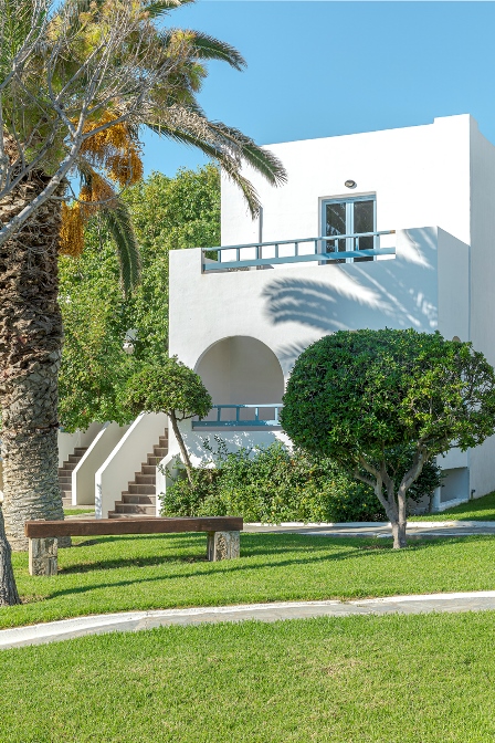 Το «Skiros Palace» είναι ένα μεγάλο συγκρότημα παραδοσιακών λευκών κτιρίων ανάμεσα σε κήπους, όπου στεγάζονται τα δίκλινα, τρίκλινα και οικογενειακά δωμάτια.