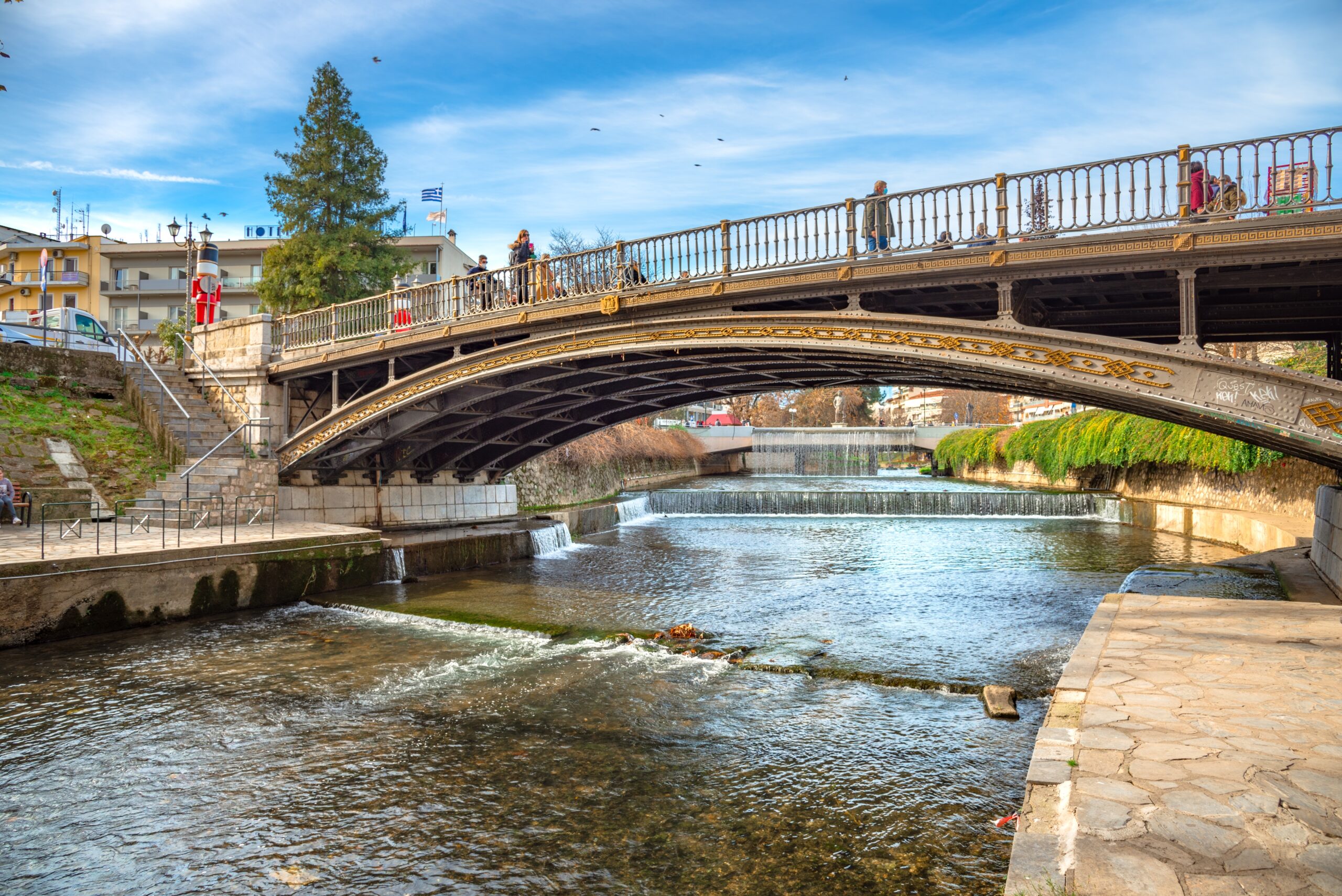 Η κεντρική γέφυρα, που ενώνει το βόρειο κομμάτι της πόλης με το νότιο, είναι ένα αρχιτεκτονικό κόσμημα. Χτίστηκε το 1886 από Γάλλους μηχανικούς της εταιρείας «Σιδηρόδρομοι Θεσσαλίας» και εικάζεται ότι βασίστηκε σε σχέδια των γεφυρών του Σηκουάνα στο Παρίσι. Πολλά από τα μεταλλικά της στοιχεία μεταφέρθηκαν από τη Γαλλία, το 1996 ανακηρύχθηκε ιστορικό διατηρητέο μνημείο και το 2015 ανακαινίστηκε και τοποθετήθηκε αρχιτεκτονικός φωτισμός. Κάτω από τη γέφυρα κυλάει ο Ληθαίος ποταμός, ένας παραπόταμος του Πηνειού, που διατρέχει όλη την πόλη και ομορφαίνει το αστικό τοπίο.