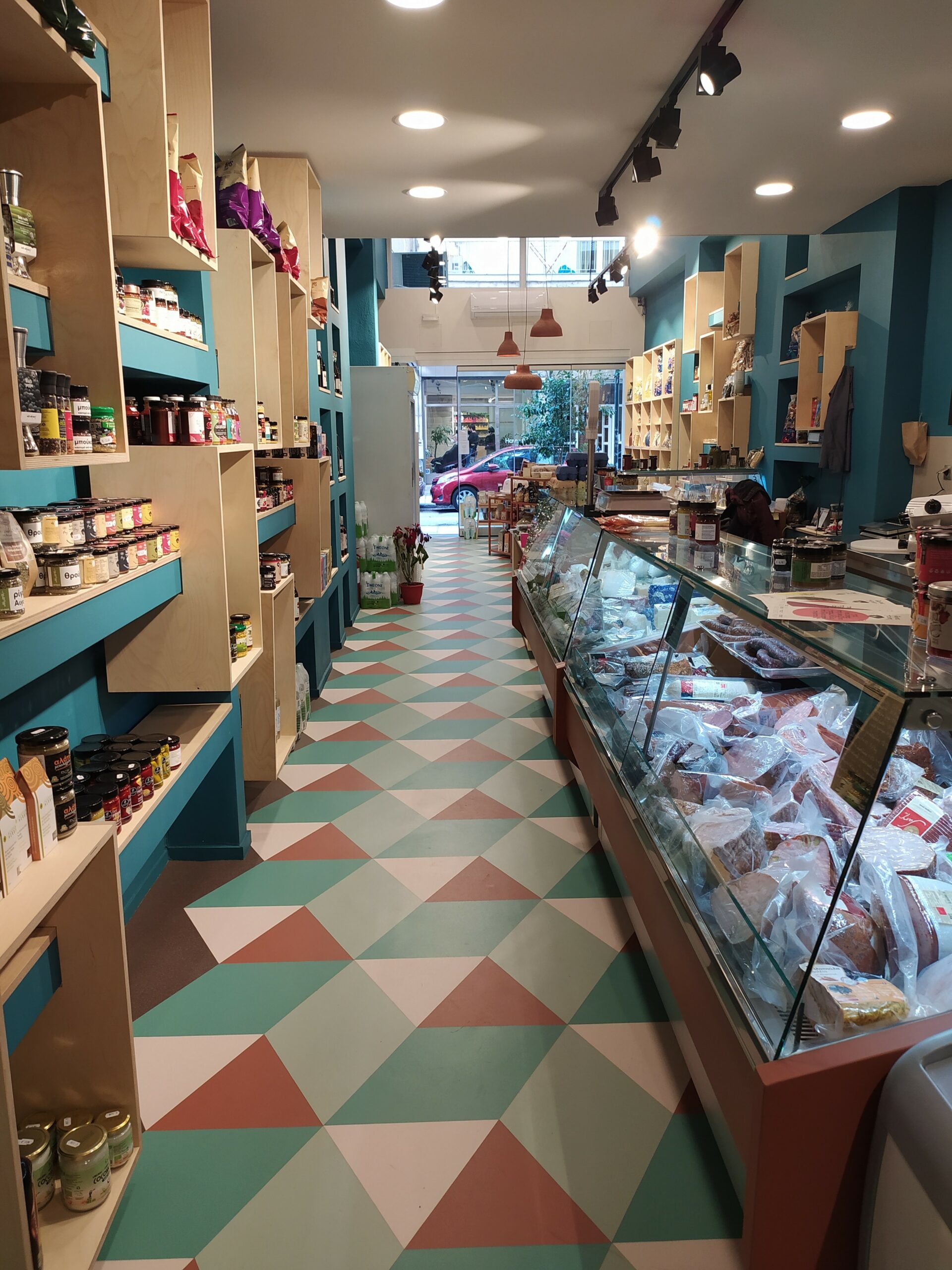 Δάπεδο από βινυλικά πλακίδια στους χρωματισμούς του πράσινου και του καφέ και στα ράφια μεγάλη ποικιλία από ζυμαρικά, βιολογικά βότανα από την Περιστερά Θεσσαλονίκης, όσπρια από το Βόιο Κοζάνης, χύμα και συσκευασμένα, αυγά ελευθέρας βοσκής, ποικιλία σε τυριά όπως το μπλε τυρί που παράγεται στη Νεοχωρούδα, ή το Αγκωνάρι από 100% πρόβειο ελληνικό παστεριωμένο γάλα, κλασικό, παλαιωμένο, με μπούκουβο, το οποίο παράγεται στους πρόποδες του Ολύμπου, τσίπουρο από παραγωγό της Άρτας, κρέας συσκευασμένο σε αεροστεγή σακούλα από βιολογική φάρμα των Ιωαννίνων, κασέρι με μαύρο σκόρδο, μουστάρδες, τσάτνεϊ γλυκοκολοκύθας, σάλτσες, αποξηραμένα μανιτάρια κ.ά.
