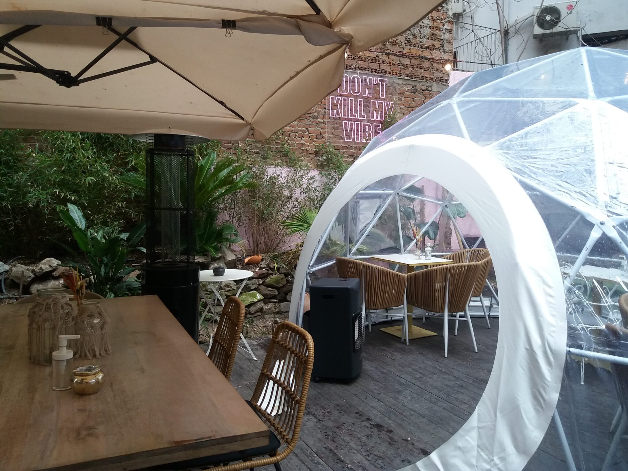Ροζ χρωματισμοί, ροζ καναπές στο εσωτερικό του Donkey, με διακριτικά χωρίσματα και σιδερένιες καρέκλες με μαύρα μαξιλάρια απέναντι του, για το νεανικό κοινό και όχι μόνο. Ινσταγκραμική διακόσμηση στον τοίχο με χρωματιστά –ψεύτικα- λουλούδια, δυο τραπεζάκια στο πεζοδρόμιο με φαρδιές πολυθρόνες αλλά και μια αυλή, ακριβώς στο πλάι, ουσιαστικά μια πρασιά που έχει μετατραπεί σε μια όαση στο κέντρο της Θεσσαλονίκης, ανάμεσα σε άχρωμες πολυκατοικίες. Και σ’ αυτήν την αυλή, την χειμερινή περίοδο – μέχρι να ζεστάνει ο καιρός- έχει εγκαταστημένες διάφανες igloo με τραπεζάκια και θερμαντικές σόμπες στο εσωτερικό τους.