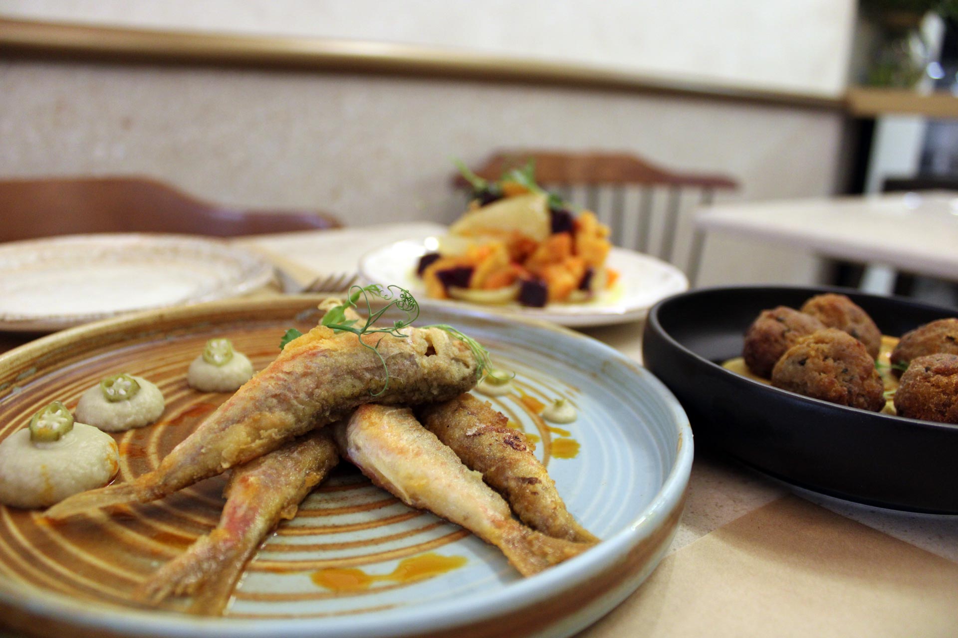 Αχνιστά ψάρια, «ωμά γεμιστά» με καπνιστή σαρδέλα, ταρτάκι κρούστας με καβούρι και αυγά πέστροφας, ορτύκι deep fry με κρέμα καπνιστού ξερού δαμάσκηνου, ψάρια σαβόρο αλλά και αρνάκι τσιγαριστό με κρέμα τραχανά και πρόβειο γιαούρτι, μελιτζάνα οφτή με καρύδι, κάρυ, κύμινο, χούμους και γιαούρτι είναι κάποια από τα ενδιαφέροντα πιάτα που αξίζει να δοκιμάζετε στα δέκα τραπέζια. Επί της Στρατηγού Καλλάρη, κάθετη πλακόστρωτη οδό, λίγα μόλις βήματα από την παραλιακή Λεωφόρο Νίκης.