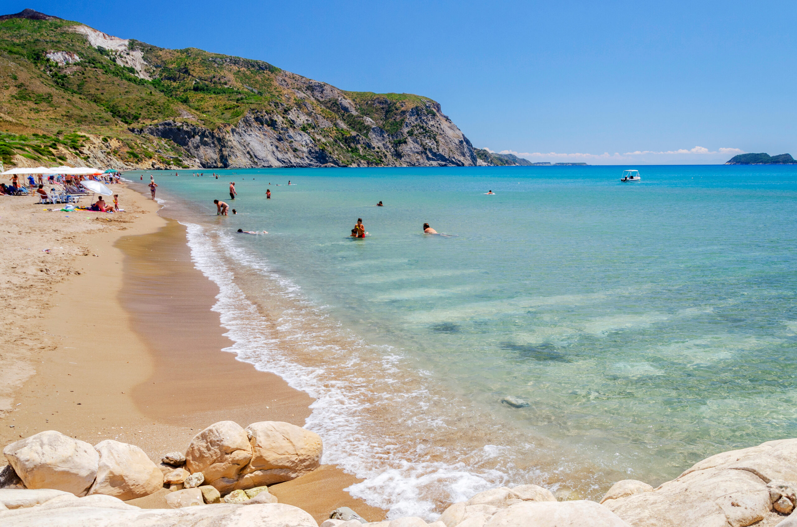 Η παραλία Καλαμάκι, στα νότια, μέρος του Εθνικού Θαλάσσιου Πάρκου Ζακύνθου, που πρακτικά σημαίνει πως εδώ γεννάνε οι χελώνες, είναι μια υπέροχη, μεγάλη παραλία με ωραία, ρηχά νερά και ψιλή άμμο. Στα νοτιοανατολικά, η παραλία Μπανάνα έχει τα πάντα, καθαρά νερά, χρυσαφένια άμμο, μεγάλο μήκος, beach bars και ελεύθερα σημεία και δίνει τη δυνατότητα για θαλάσσια σπορ. Λίγο πιο νότια, η παραλία του Γέρακα είναι αμμώδης, με ρηχά νερά ενώ σε πολλά σημεία της θα βρείτε φωλιές θαλάσσιων χελωνών καρέτα -καρέτα. Εδώ, καλό είναι να έρθετε πιο οργανωμένοι καθώς δεν υπάρχει κάποιο αναψυκτήριο, παρά μόνο κάποιες ξαπλώστρες. Ωστόσο, στον οικισμό ακριβώς από πάνω θα βρείτε ταβερνάκια και σούπερ μάρκετ. Στα ανατολικά του νησιού, οι Αλυκές είναι οργανωμένες, με ταβερνάκια, ξενοδοχεία, ξαπλώστρες, beach bars, θαλάσσια σπορ και ένα μικρό ρεματάκι να εκβάλλει στο πλάι.