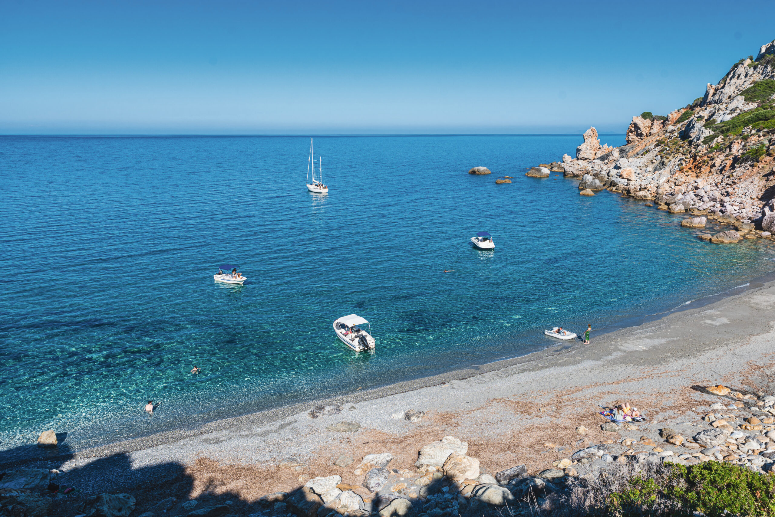 Ανεβαίνοντας προς τα βόρεια του πιο πράσινου νησιού του Αιγαίου και αφού επισκεφθείτε τη Μονή Ταξιαρχών μέσα σε πυκνά πευκοδάση, αξίζει να κατηφορίσετε στην Περιβολιού, μία από τις πλέον άγριες και άσπιλες παραλίες της Σκοπέλου. Όπως σε όλες σχεδόν τις παραλίες των Σποράδων, η Περιβολιού χαρακτηρίζεται από τα ολοστρόγγυλα, σμιλεμένα από τα κύματα και τον αέρα βότσαλα που λαμπυρίζουν σε όλες τις αποχρώσεις του γαλάζιου και του πράσινου στον βυθό της παραλίας.