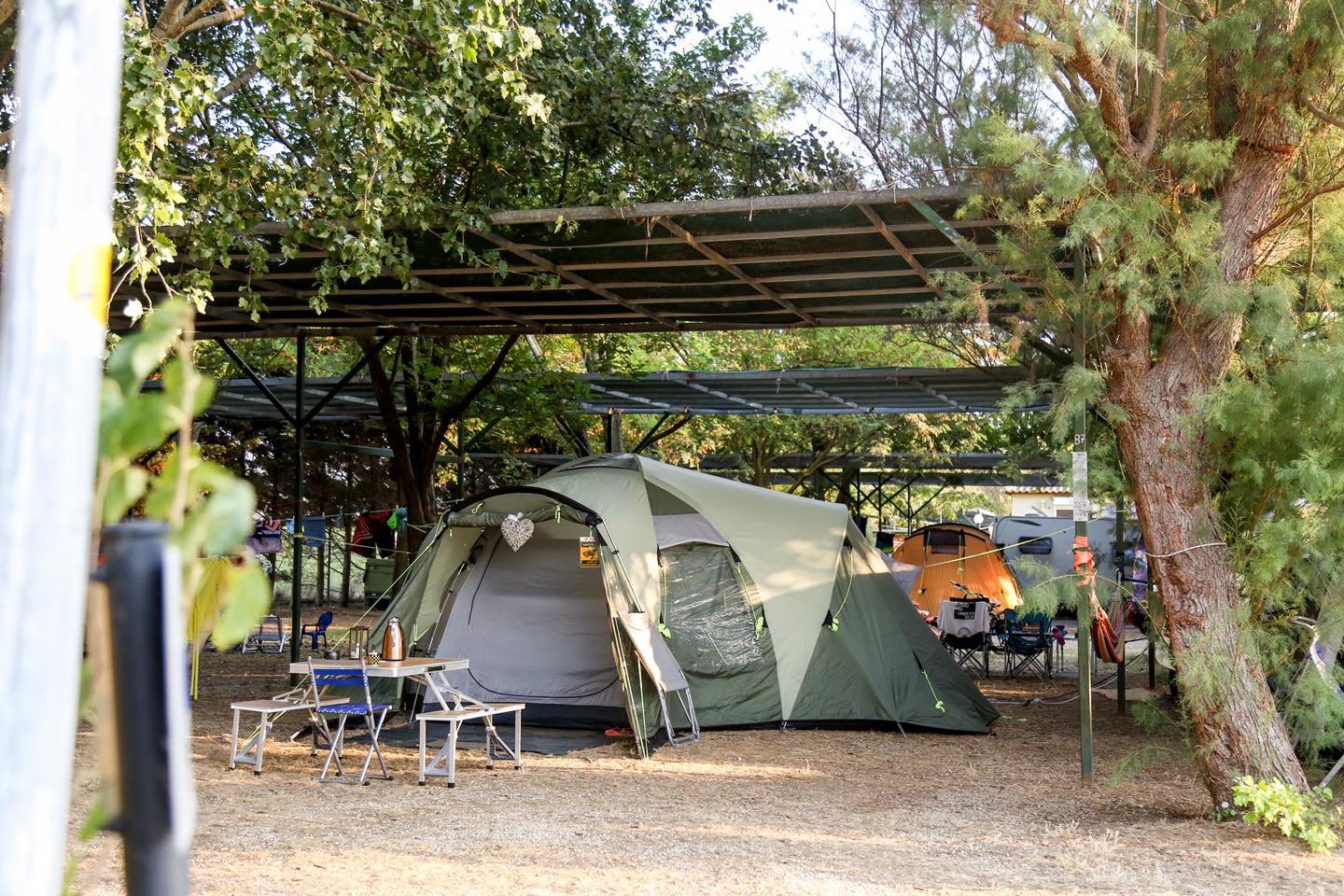 Απλώνεται ακριβώς πάνω σε μία όμορφη αμμώδη παραλία στον όρμο του Ναυαρίνου. Εδώ, μπορείτε να στήσετε τη σκηνή σας, να παρκάρετε το τροχόσπιτό σας αλλά και να νοικιάσετε μπάνγκαλοου για περισσότερη άνεση. Στο χώρο θα βρείτε πλυντήρια, εστιατόριο, καφέ, αποθήκη για να βάλετε τη σανίδα του surf κ.ά. Επίσης, βρίσκεται πολύ κοντά στη λιμνοθάλασσα της Γιάλοβας που αποτελεί καταφύγιο άγριας ζωής και μπορείτε να κάνετε birdwatching εάν σας αρέσει το σπορ, ενώ λίγο πιο δίπλα βρίσκεται η διάσημη παραλία της Βοϊδοκοιλιάς για να απολαύσετε ινσταγκραμικές βουτιές.