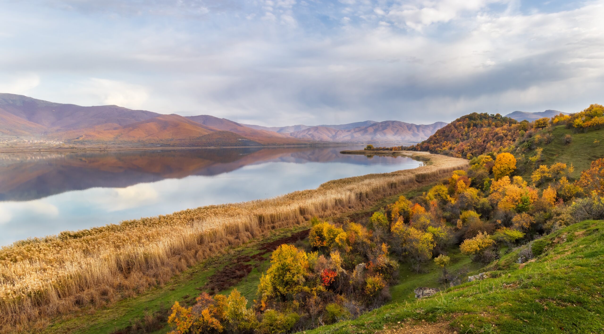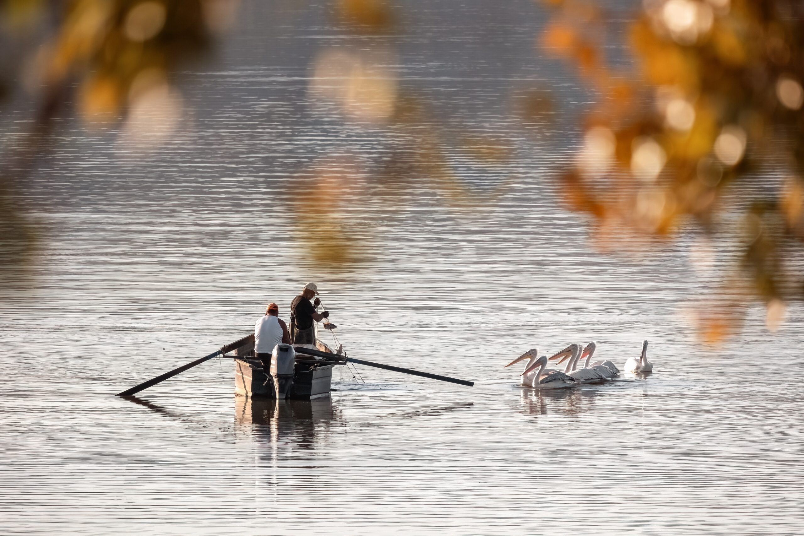 Στο βορειοδυτικότερο άκρο της Ελλάδας, κάτω από τις σκιές των ορεινών όγκων της Δυτικής Μακεδονίας, εκεί όπου συναντιούνται τα σύνορα τριών χωρών, απλώνονται οι Πρέσπες. Η Μεγάλη Πρέσπα, μοιρασμένη ανάμεσα σε Ελλάδα, Αλβανία και Βόρεια Μακεδονία, μεταμορφώνει αυτή την εποχή τις όχθες της με τις ζεστές αποχρώσεις του φθινοπώρου, ενώ κοπάδια πουλιών γεμίζουν τον ουρανό πάνω από το χωριό Ψαράδες, σχηματίζοντας ταξιδιάρικες γραμμές στον αέρα.