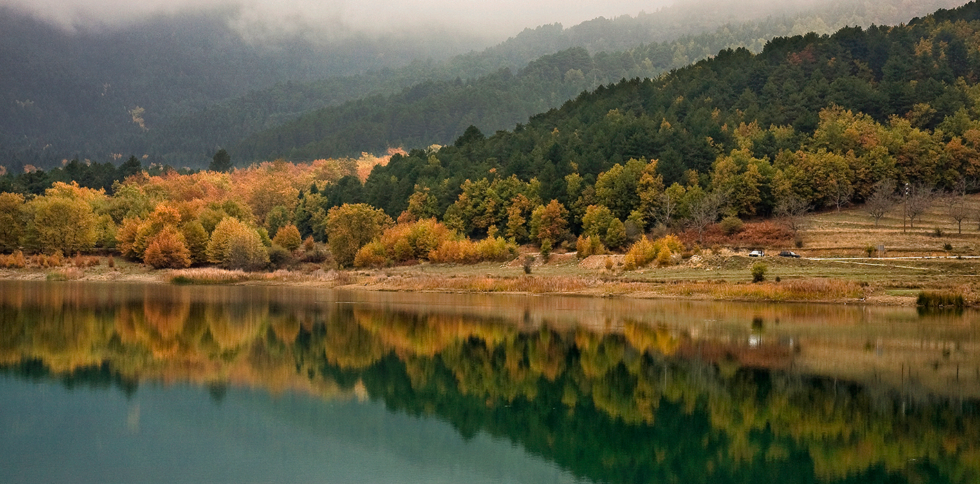 Μέσα στα απέραντα δάση της Πίνδου, σε υψόμετρο σχεδόν 1.300 μέτρων και μόλις λίγα χιλιόμετρα από το παραδοσιακό Μέτσοβο, απλώνεται με μεγαλοπρέπεια η Λίμνη Πηγών Αώου. Δημιουργήθηκε τη δεκαετία του ’80 με την κατασκευή φράγματος για την υδροδότηση των Ιωαννίνων, όμως σήμερα δείχνει να ανήκει φυσικά στο τοπίο. Αγκαλιασμένη από οξιές, έλατα και μαυρόπευκα που το φθινόπωρο βάφονται σε αμέτρητες αποχρώσεις: κόκκινο βαθύ, κεχριμπαρένιο, χρυσαφί και σκούρο πράσινο, καθρεφτίζει στα νερά της ένα μωσαϊκό μοναδικής ομορφιάς.
