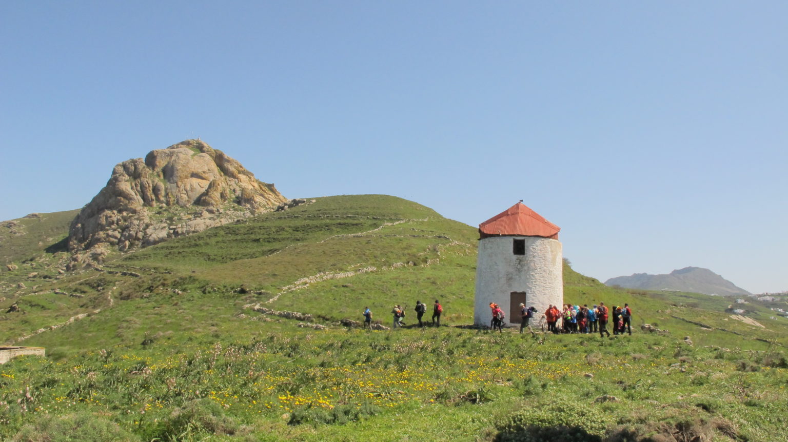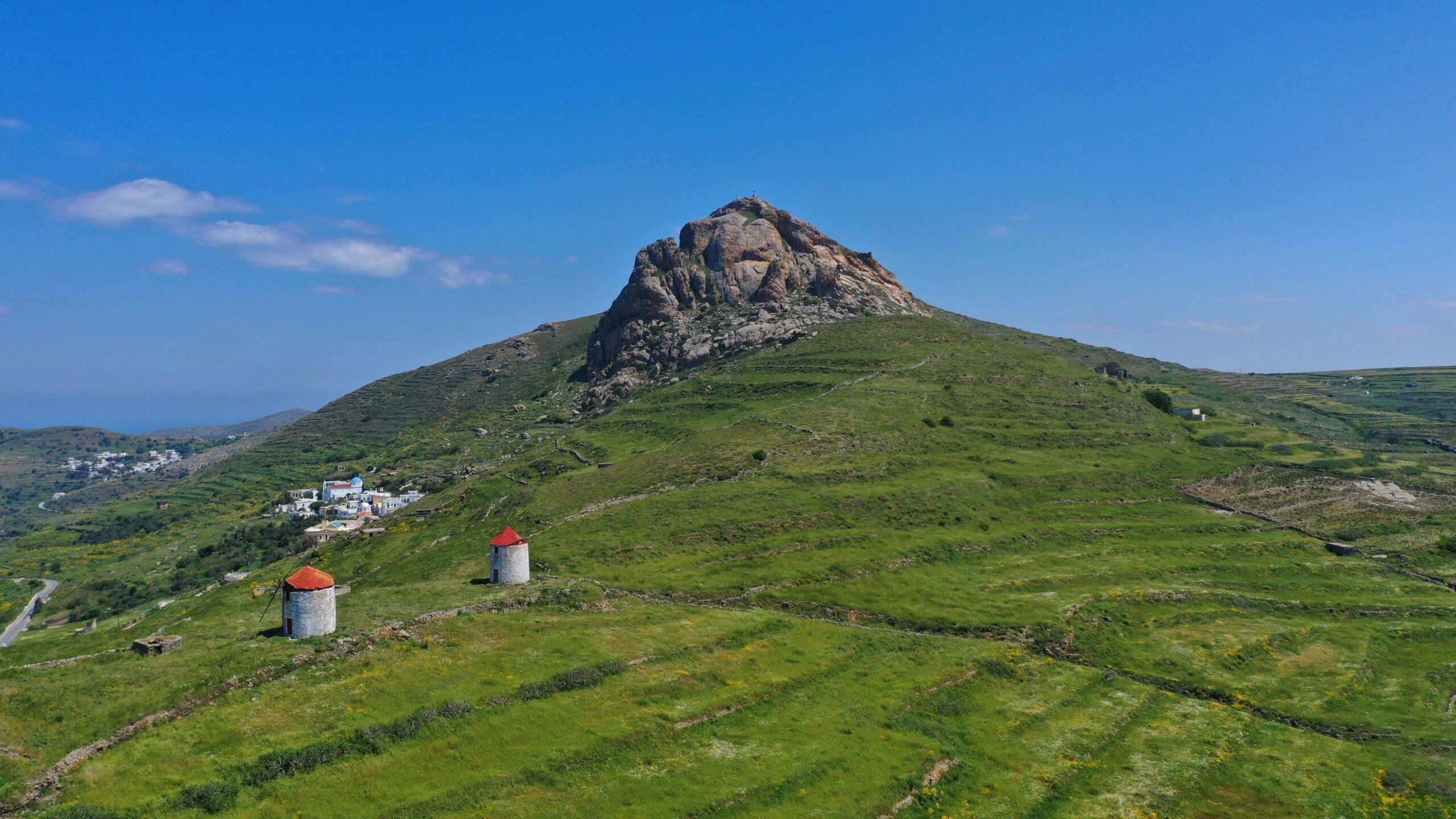 Την άνοιξη οι πλαγιές γεμίζουν με λούπινα, φρύγανα, θυμάρι και πικροδάφνες, χαρίζοντας ζωηρά αρώματα στο κυκλαδίτικο τοπίο, ενώ όσο πεζοπορείτε δεν είναι απίθανο να συναντήσετε κάποιο από τα πολλά αγριοκάτσικα του νησιού να περιπλανιέται με ευκολία στο απαιτητικό ανάγλυφο. Επιλέγοντας τη διαδρομή Μ1, στην καρδιά του νησιού, γνωστή ως Πάνω Μέρη, διασχίζει κανείς την ενδοχώρα του νησιού και περνά από παραδοσιακούς οικισμούς όπως ο Φαλατάδος, η Στενή, η Μέση και ο Μουντάδος, συναντώντας στην πορεία μικρά γραφικά εκκλησάκια. Η διαδρομή Μ4, γνωστή και ως «Ο Δρόμος του Νερού & του Κάστρου», οδηγεί στο ενετικό κάστρο του Ξώμπουργου και στο μοναδικό γεωλογικό αξιοθέατο του νησιού, τους γρανιτένιους βράχους του Βώλακα. Όποια διαδρομή και αν επιλέξετε στο ιδιαίτερο ανάγλυφο του κυκλαδίτικου νησιού, το τηνιακό στοιχείο αναδύεται αποκαλύπτοντας ένα νησί που ανακαλύπτεται βήμα-βήμα.