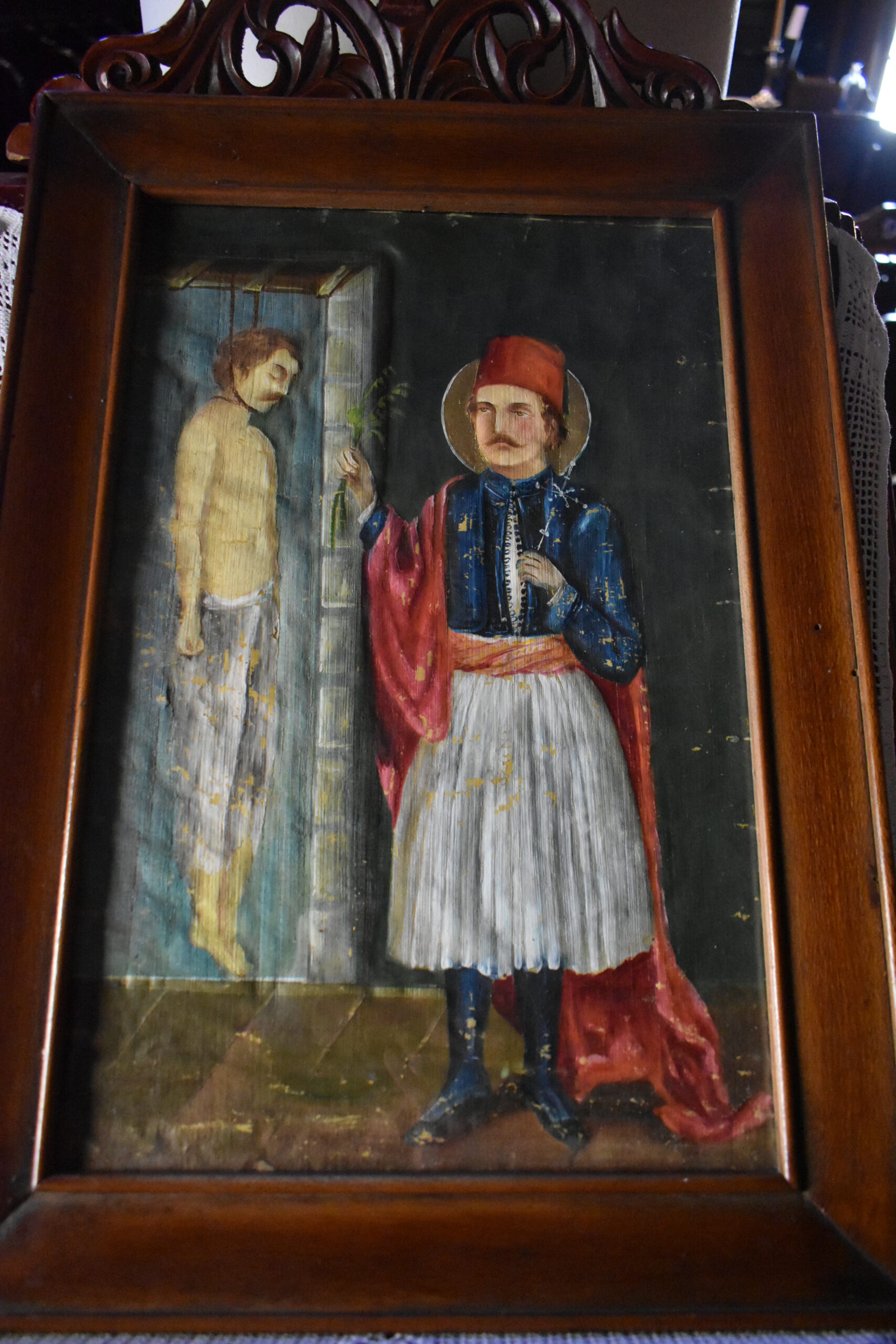 The interior of the three-aisled basilica is particularly impressive, mainly due to the exceptionally tall, gilded wooden-carved baroque iconostasis, which is widely regarded as the most magnificent and intricate on the entire island. It makes the whole interior sparkle, creating a wonderful contrast with the intense blue-coloured sky, which is also adorned with golden framed frescoes. Don’t miss the icon of Kyra Faneromeni, the one of the Prophet Elijah, a work by Corfiot painter Spyridon Prosalentis (1830 – 1895), and that of Saint George of Fustanella, a new martyr from Ioannina who refused to convert and was hanged by order of Kati Pasha, a martyrdom depicted in his icon.