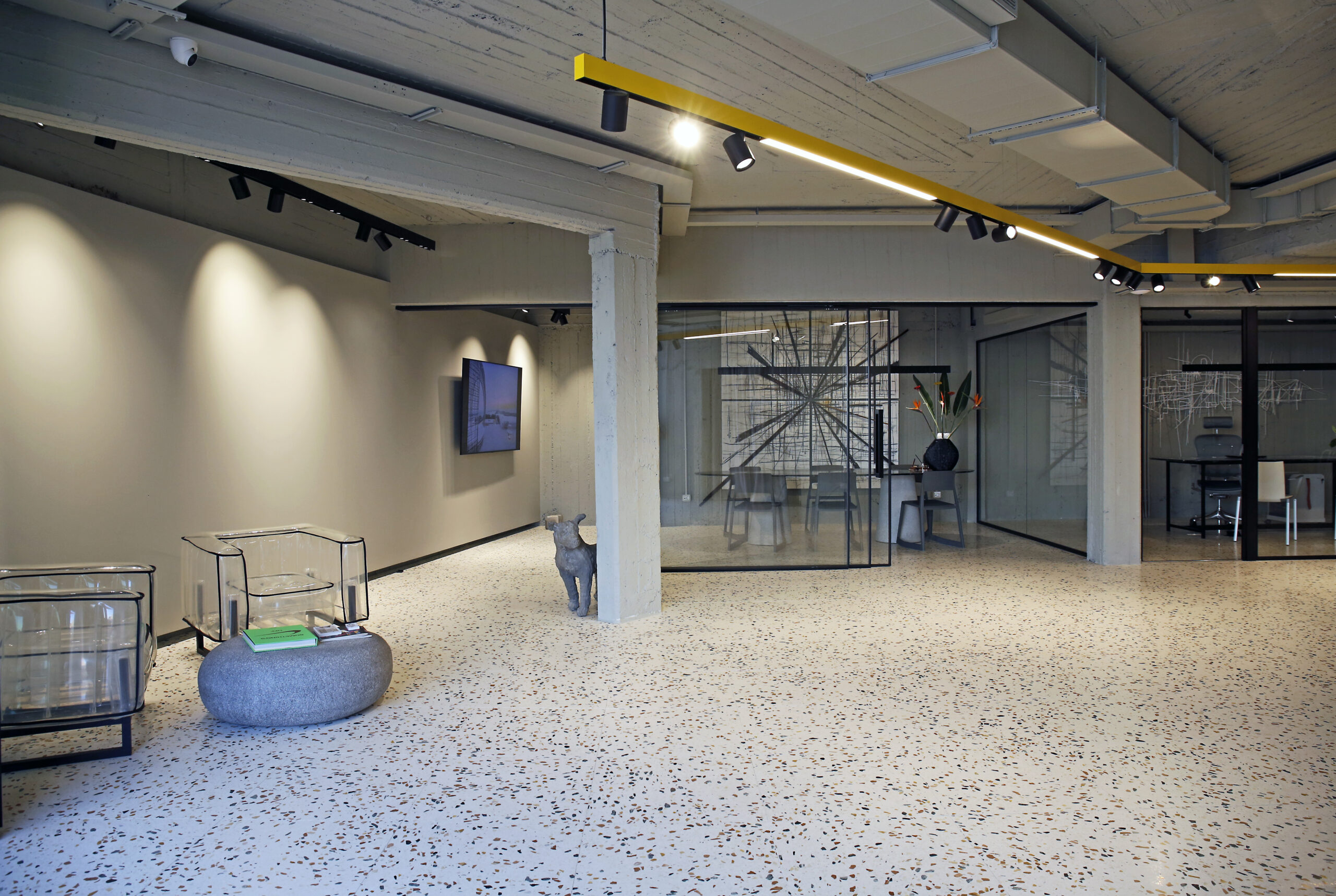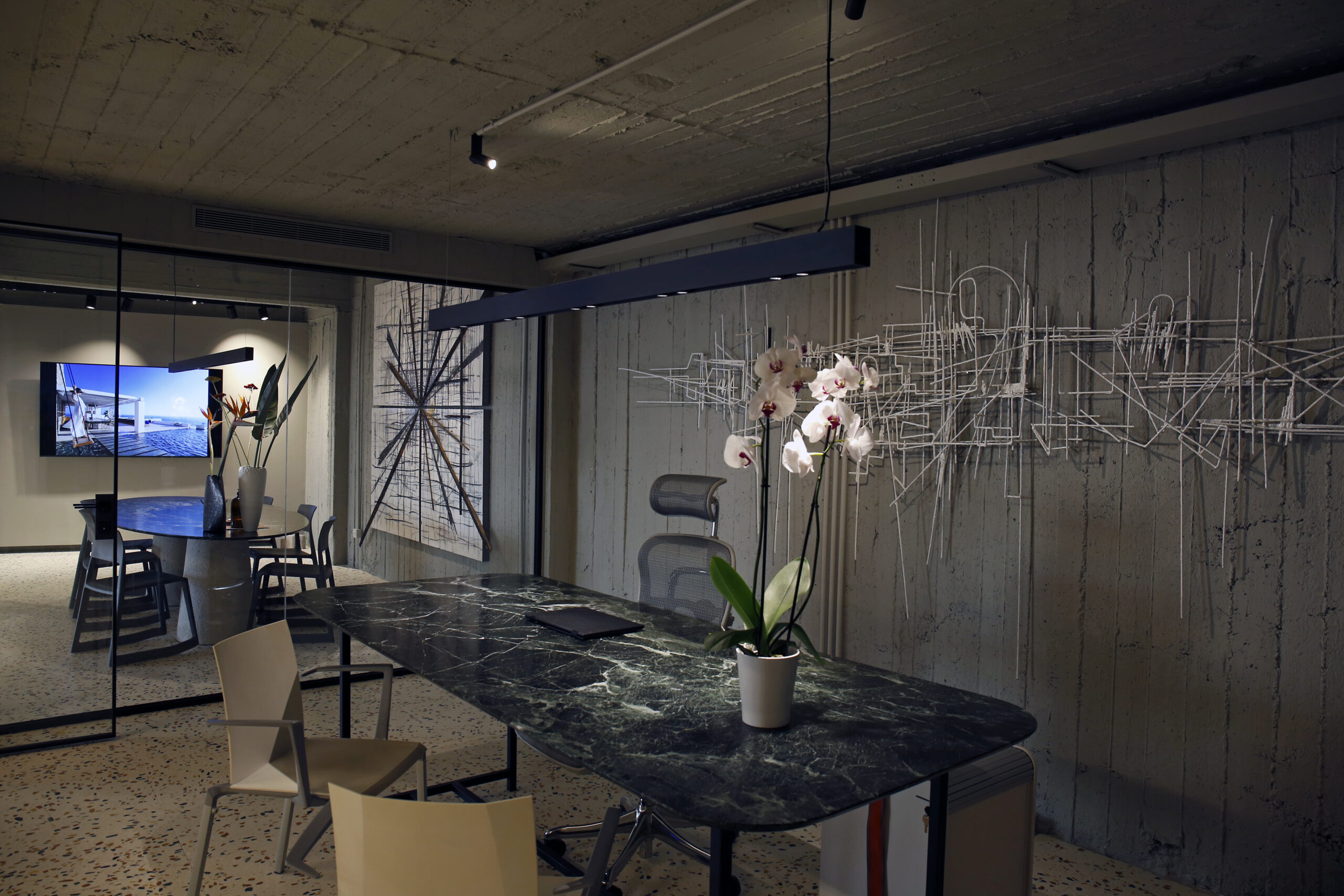 Stark modern offices, made with excellent materials, cut off from the rest of the space, decorated with colourful flowers and beautiful artworks by Vassilis Kavouridis; offices that, with the opening of a glass door, fully connect all four corners of the space.