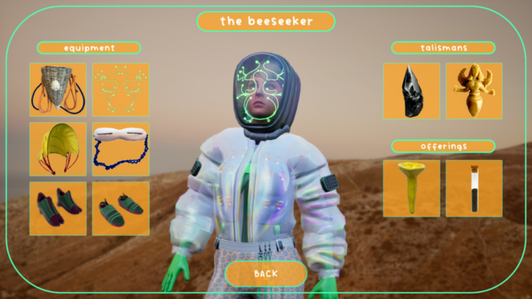 Conceived as an evolving ecosystem rather than a closed exhibition, Telling the Bees unfolds across video, sculpture, drawings, textiles, sound, and ritual objects. Research, folklore, speculative thinking, and feminist theory intersect alongside Telling the Bees (The Game), a video game developed as part of the same narrative world. The Beeseeker, moving through an Aegean landscape marked by environmental exhaustion, anchors an exploration of care, shared knowledge, and interspecies communication.