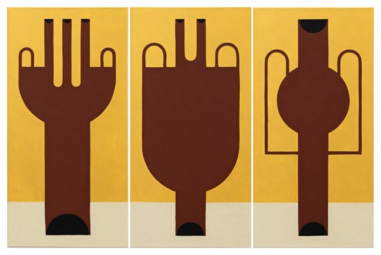 At first glance, the works appear rigorously ordered. Spend time with them and a quieter tension emerges. Psyllaki draws on architectural training, mythological references, and the human figure to construct paintings where precision never erases the presence of the hand. Repeating motifs, vessels, paired forms, balanced structures, suggest intimacy and interdependence as compositional logic rather than metaphor.