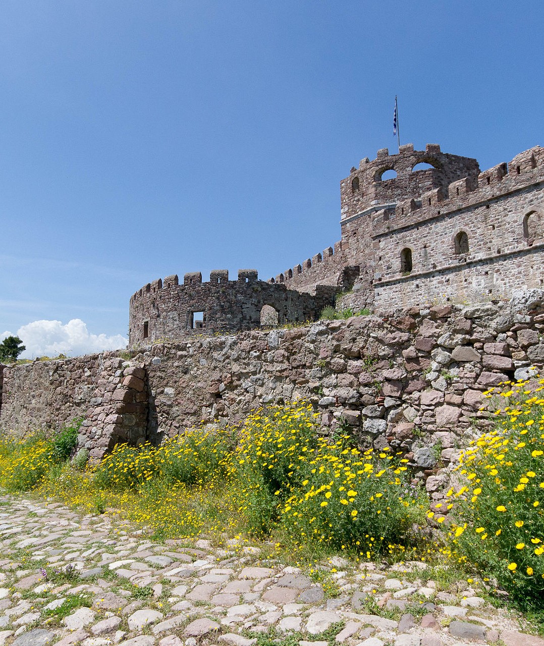 At dusk in Molyvos, the sun-soaked Byzantine castle turns molten in the last rays, a survivor standing firmly atop a black, glittering hill of stunningly maintained stone houses and bougainvillea. Below, the Aegean shifts from metallic cobalt to a velvety midnight blue.