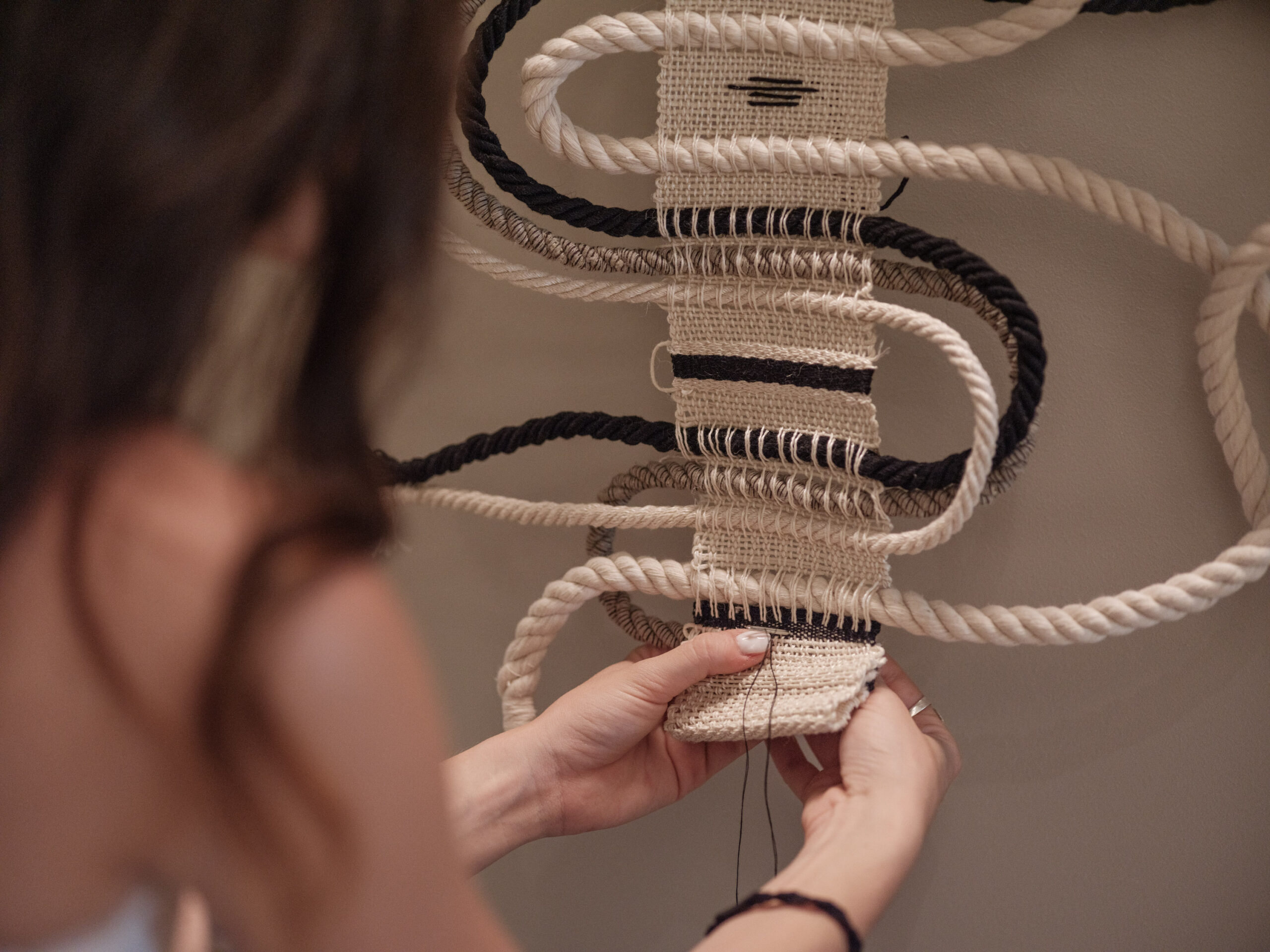 “In ‘Resilient Thread,’ I revived the patterns and techniques of passementerie on a proportionally enlarged scale with new compositions and materials, aiming to give it the attention it deserves, making it the central element of the narrative, both literally and metaphorically. This work is entirely handmade, even the cords I use as wefts are handcrafted and unique, which directly relates to the concept of care, as handmade objects reflect the dedication and time invested in their creation. The work embraces diversity and represents inclusivity, speaking about the ‘margins,’ what has been neglected.