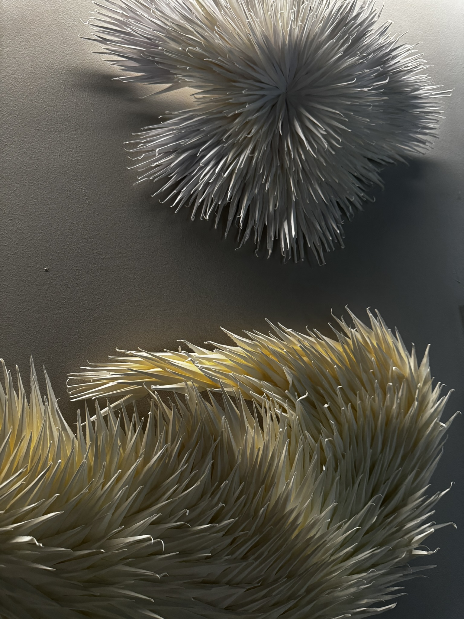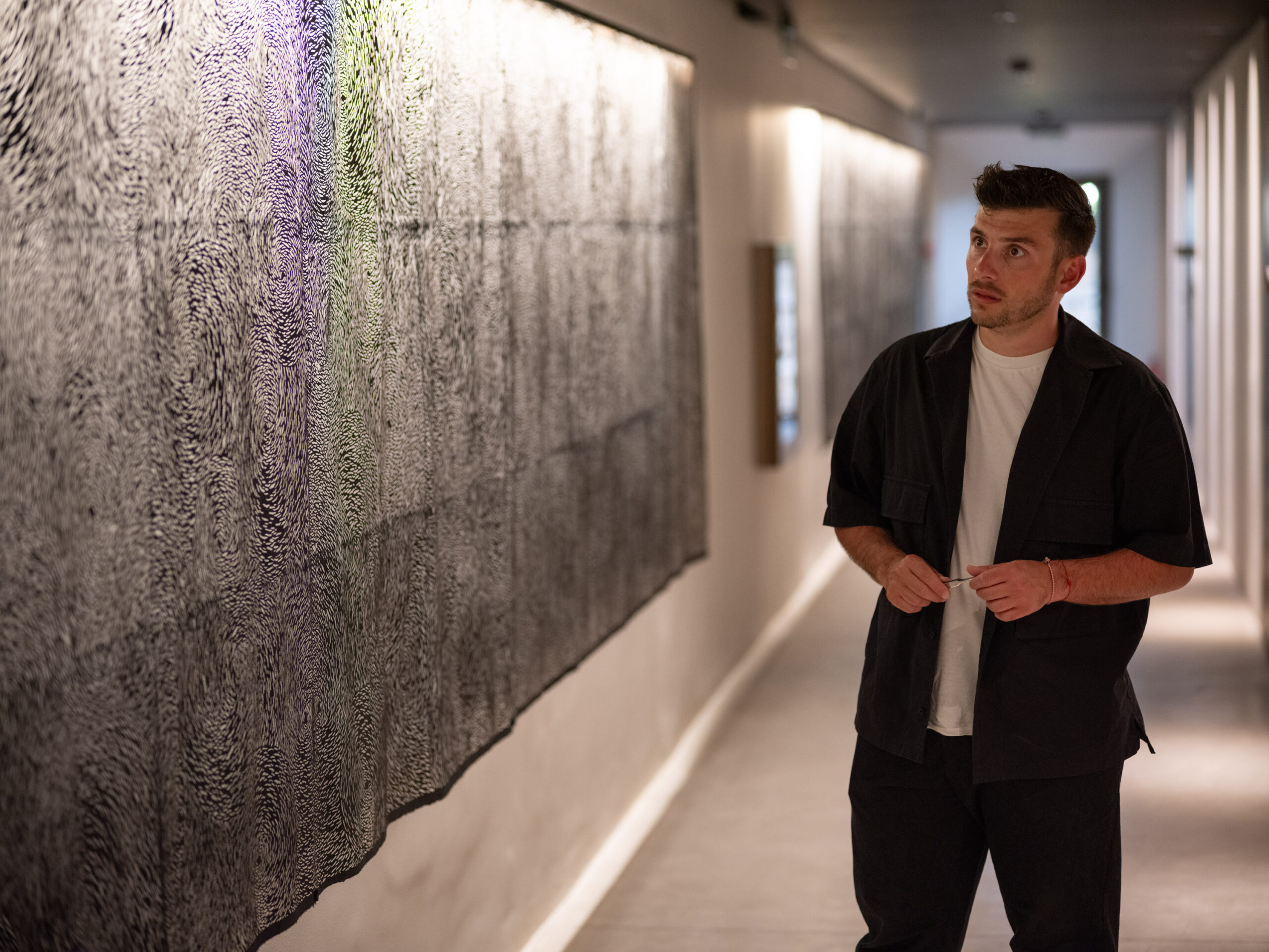 This year’s three winners, Irini Miga, Stratis Tavlaridis and Katerina Nakou are all Greek, despite the majority of submissions being international – from 72 countries. Their entries excelled in meeting the competition’s criteria, which called for large-scale projects designed to be focal points within their exhibition spaces. The artists aptly tailored their concepts to the unique characteristics of the venues, using floor plans, precise dimensions, and photographs to guide their creations. The resulting pieces are meticulously made to fit the hotel’s expansive corridors, offering guests, staff and outside visitors alike an experience that can be as breezily passed by, perhaps absorbed quiescently, as it can be deeply engrossing for those stop to really get drawn in and connect.