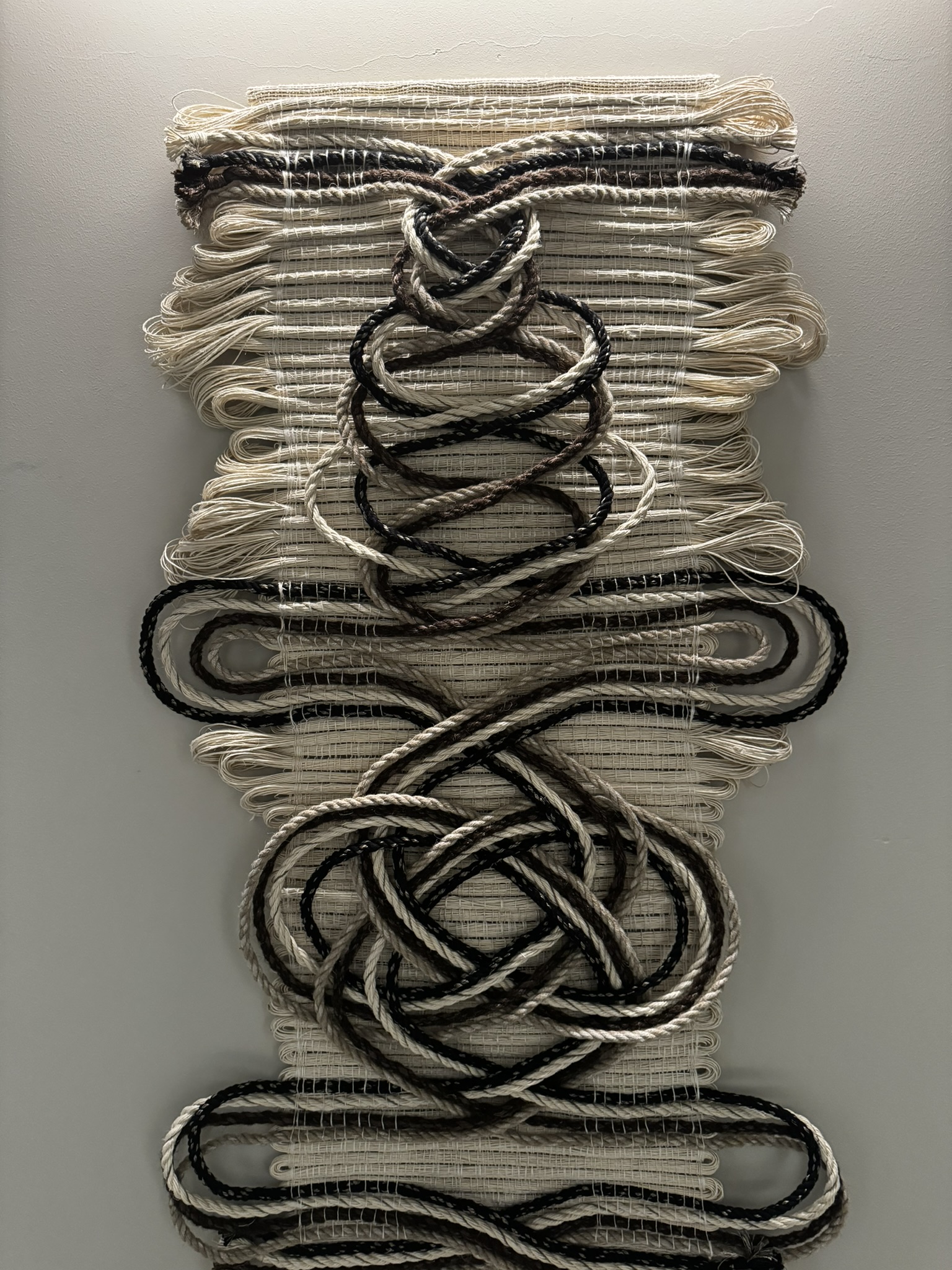 Katerina Nakou’s ‘Resilient Thread’ features large-scale compositions woven on a loom, transforming the decorative elements of passementerie—a nearly extinct art traditionally adorned textiles’ edges—into the central focus of her narrative. “My fascination with fabric in an artistic context began during my studies in Textile & Fashion Design in Germany,” she said. “I wanted to see it for what it is, not just what it is destined to become in fashion or decoration. My deeper understanding of textile art came through my postgraduate studies and my specialization in jacquard weaving at the Textiel Museum in the Netherlands, where I worked on artistic and research projects. This experience opened up a new world for me, a liberating journey where I could experiment with techniques, textures, and materials without product design constraints.