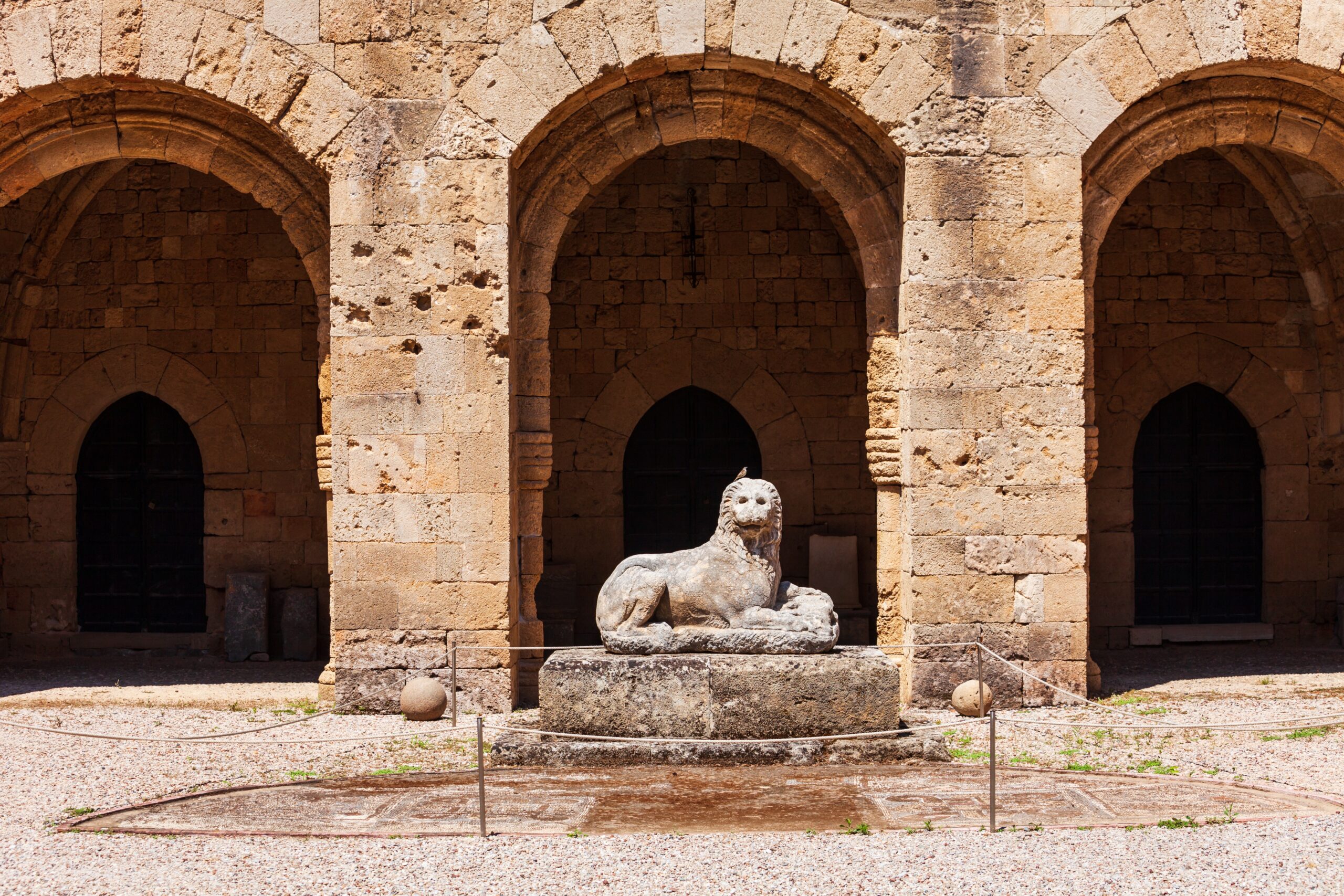 The Palace of the Grand Master, rising just beyond, dominates the skyline. Constructed in the 14th century on the site of a Byzantine fortress, it was restored by the Italians in the 1930s after being damaged by an explosion. Its vaulted halls and mosaic floors recount the island’s evolution from early Christian Rhodes through the Ottoman era, while its arcaded courtyards open onto views of the sea.