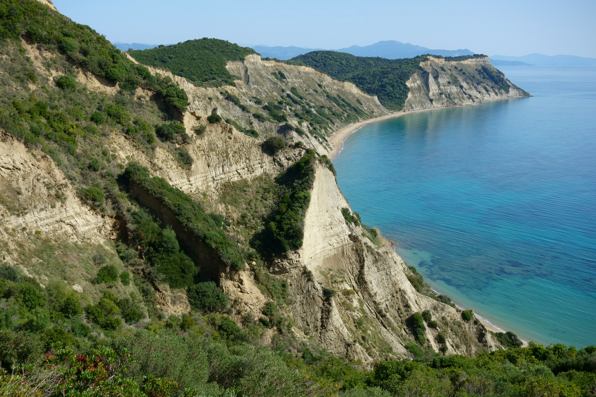 At the southern end of the island, 50 km from the Old Town, Arkoudilas beach is a real paradise; a very long beach with fine sand and warm shallow waters with steep high cliffs looming above. You will hardly meet people here, as it takes about 2 km of dirt road to reach the beach. A few sunbeds and umbrellas are the only things available on the beach, as well as a quaint little café serving coffee, cold water and refreshments.