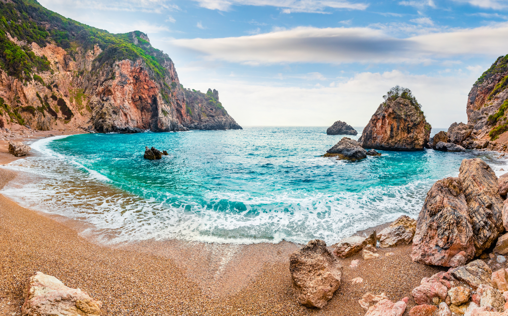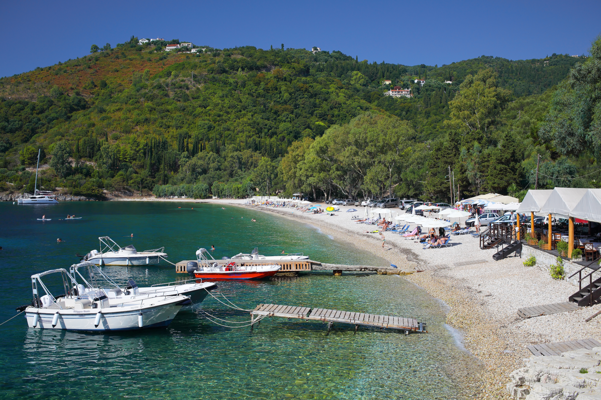 It is probably one of the most unknown beaches but also one of the most beautiful of Corfu. Driving from the Old Town towards Paleokastritsa, take a turn towards the village of Liapades. You will need to walk for about 10 minutes to reach the enchanting beach with the fine pebbles and crystal clear turquoise waters. The beach is not serviced and there is not much shade except for the small area below the rocks on the left, so you should bring an umbrella, some water and your own supplies. Sometimes a boat passes by selling cold drinks, water and coffee. The sea is cold, as it is in the whole area of Paleokastritsa.
