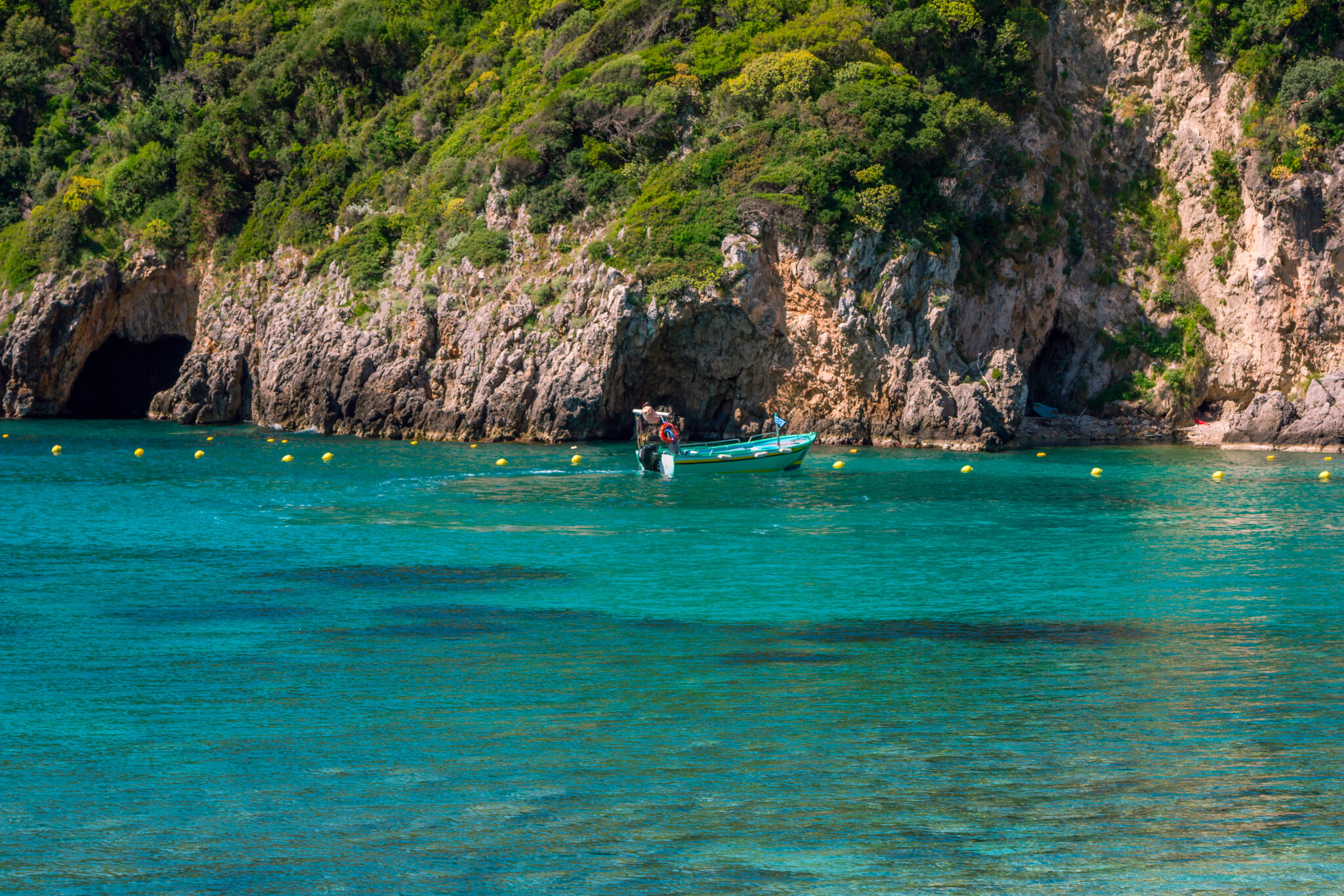 On Corfu, the tall rocks with greenery around Paleokasritsa bay have produced miracles in the shape of small and large sea caves, there to be discovered for superb swimming in blue waters. Nafsika cave, the best-known of all the caves in the region, named after the daughter of the king of the Phaeacians, offers superb waters. But do not restrict your experience to this cave. Make sure to also visit Agios Nikolaos cave. Small boats offer transportation to these caves. They can also be visited on private boats for exploration at your own pace.
