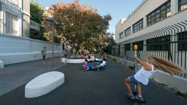 In the Makriyanni neighborhood, near the Acropolis Museum and the Lalaounis Jewellery Museum, the unique ‘Six Thresholds’ playground, designed by PX Athens architects, is divided into six sections with parabolic concrete play areas that double as seating and play structures. The design blends seamlessly into the surrounding urban landscape, which includes a school, and invites children to an innovative play experience. It’s a creative and interactive space designed for community engagement, offering a creative twist on the traditional playground.