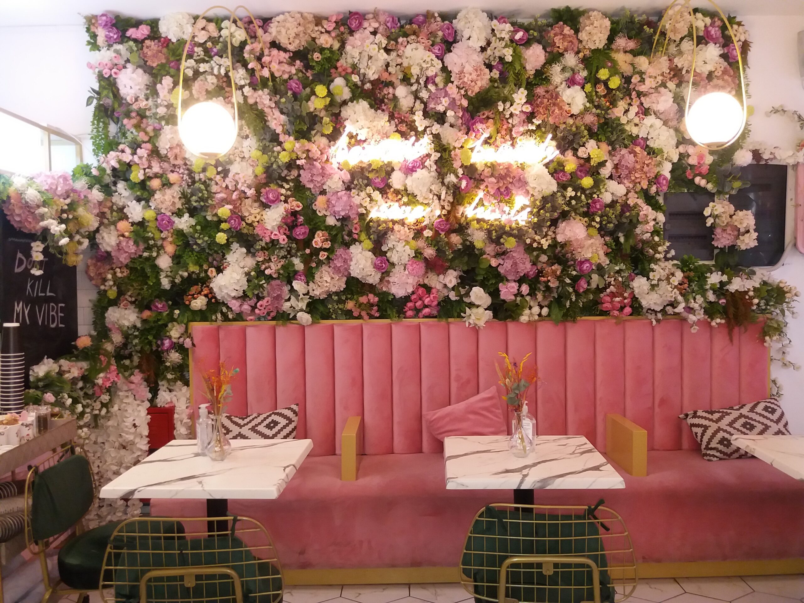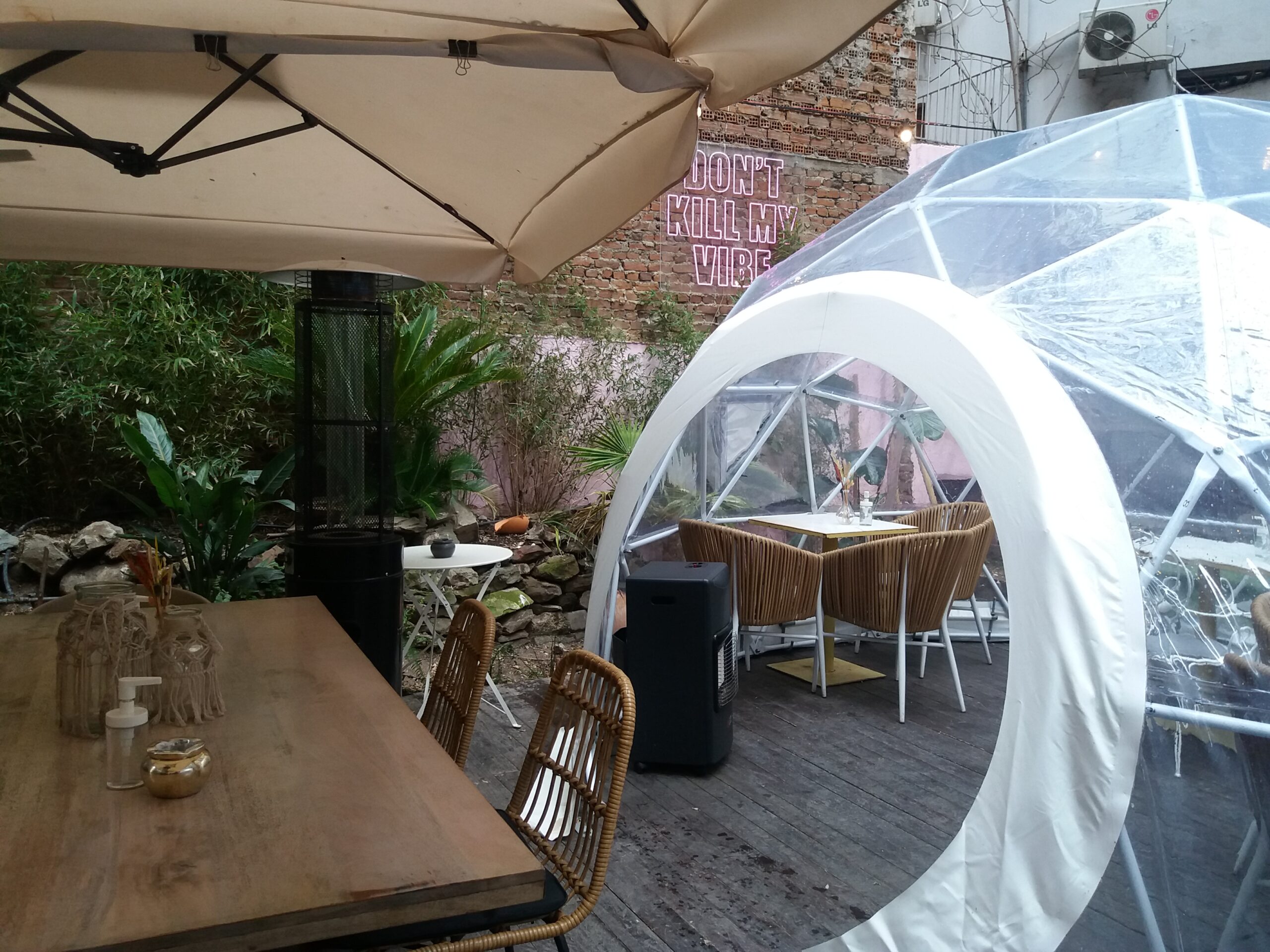 Pink colour scheme with discreet partitions and iron chairs with black cushions opposite a marshmallow pink sofa, to suit the young audience and not only; instagramatic decoration on the wall with colourful -fake- flowers, two tables on the pavement with wide armchairs and a courtyard, right on the side, essentially a green space that has turned into an oasis in the centre of Thessaloniki, among colourless apartment buildings. And in this courtyard, in winter – or until the weather warms up – the Donkey has installed transparent igloos with tables and heating stoves inside.