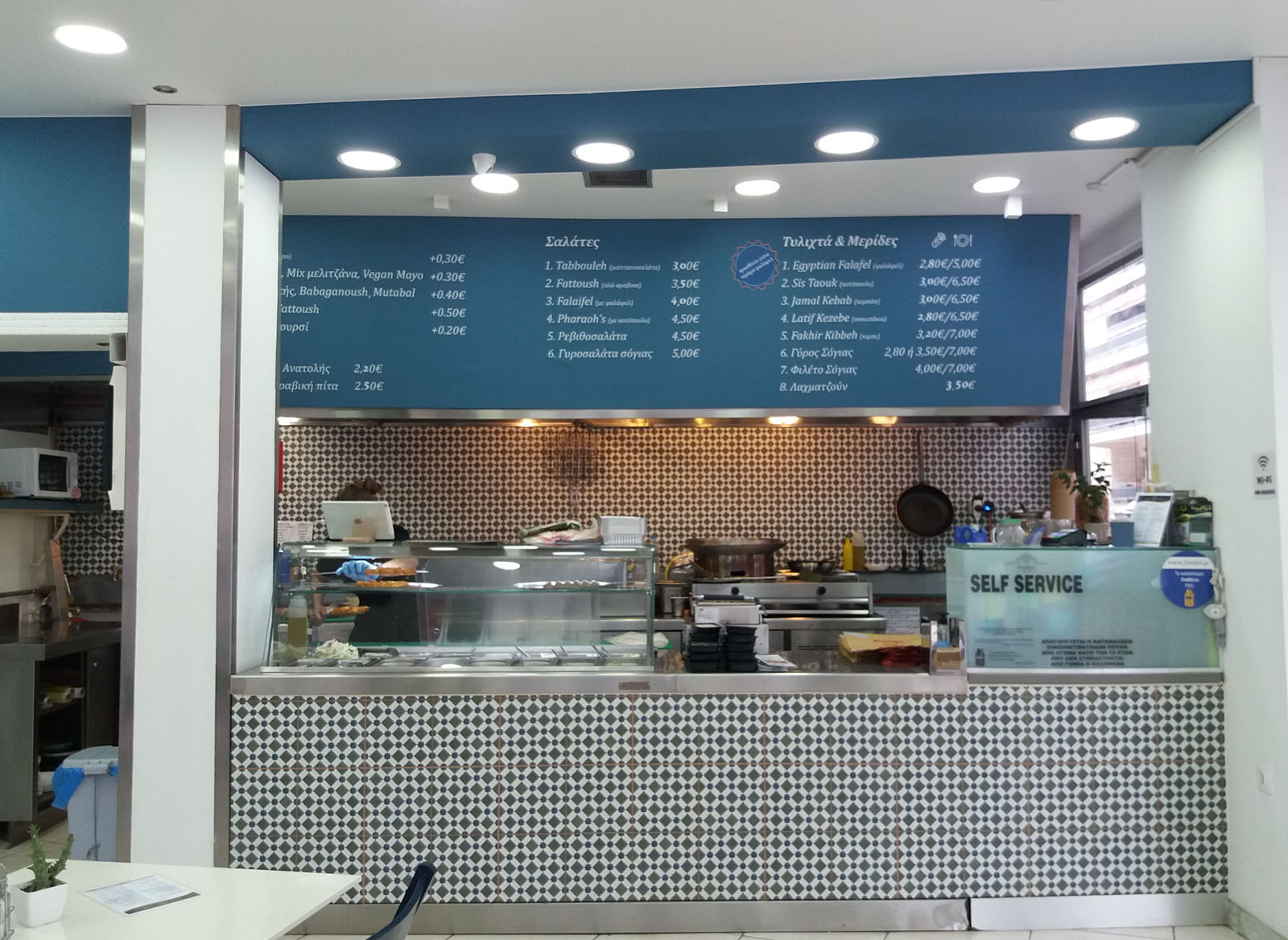 Small but miraculous spaces with Moroccan tiles in shades of blue. Try Egyptian falafel with tahini sauce and garlic cream, tomato, cabbage, parsley and hot spices in a wrap or as a serving; sis taouk, i.e. pieces of chicken breast marinated with oriental spices, mustard sauce, garlic cream, tomato, cabbage, parsley and hot spices wrapped or as a serving; Jamal kebabs with ground beef and lamb, latif kezebe (chicken livers with spices, peppers and everything else), aromatic beef or mushroom meatballs with bulgur and pine nuts and of course lahmacun. The menu also includes some vegan and vegetarian options, such as organic soya gyros, hummus, salads (tabbouleh, fattoush, falafel, etc.) and a new option, i. e. eggplant, tabbouleh, hummus, cabbage, pickles, vegan mayonnaise in Cypriot pitta bread. The menu also includes a few desserts, which are available daily, except Tuesdays at the shop in the city centre and Mondays at the shop located in Analipsi.