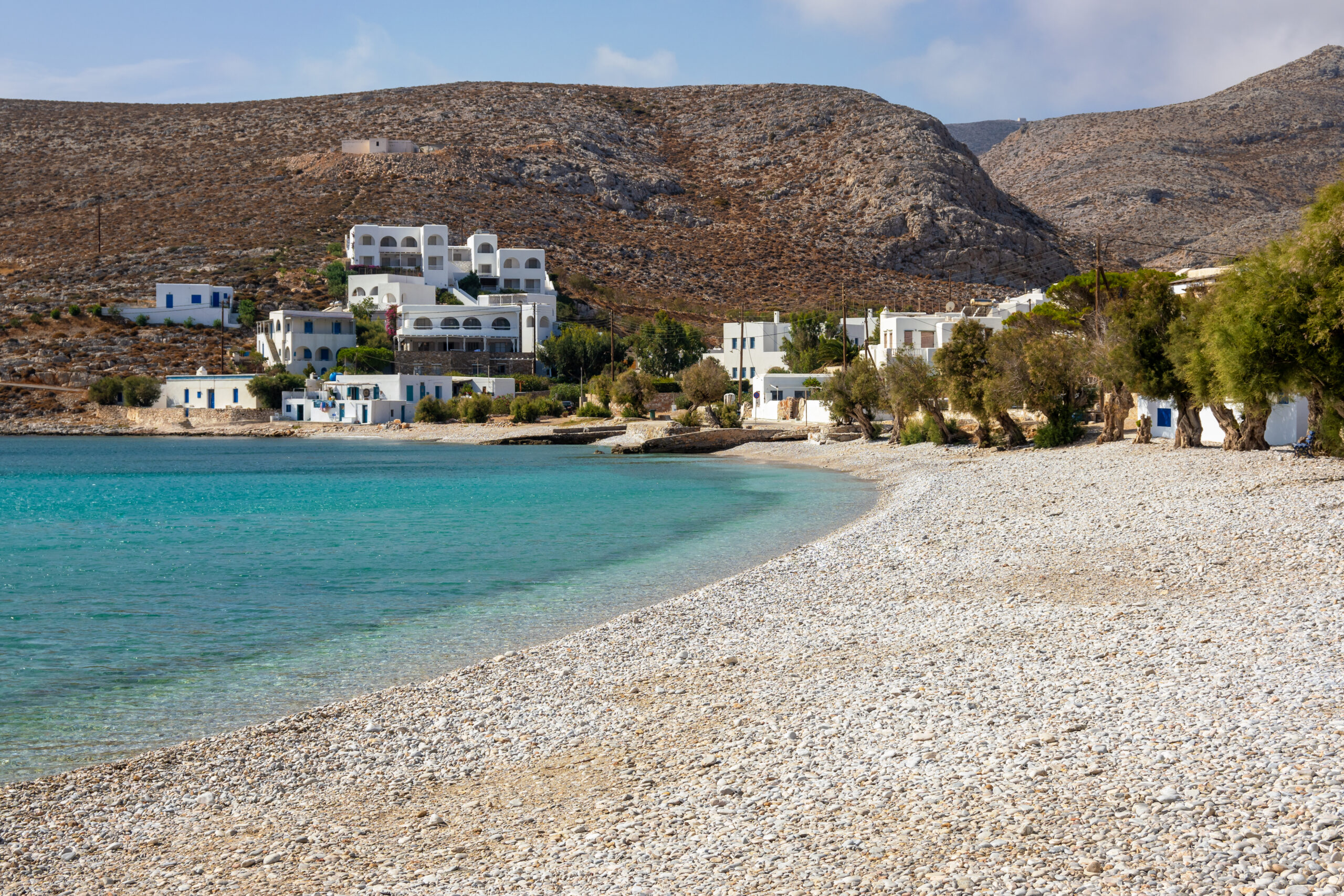 A small beach with both sand meets pebbles, reached via a 15-minute trail from Agali.