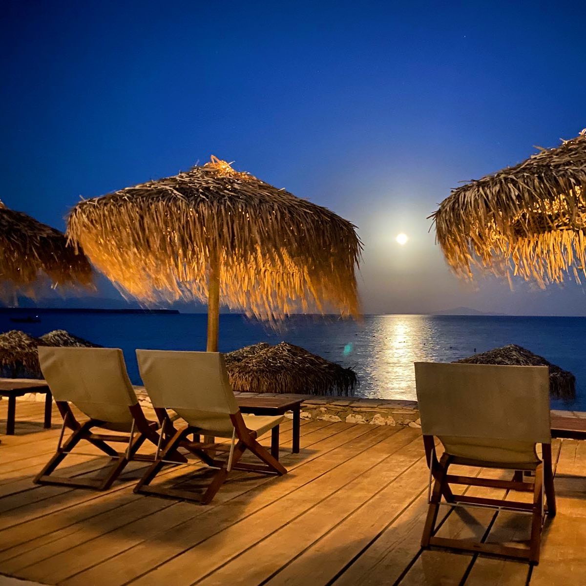 There’s a small beach bar on the beach, under the tamarisk trees, ‘Krios Lounge’, that stays open till late at night, serving coffee, salads and even souvlaki.