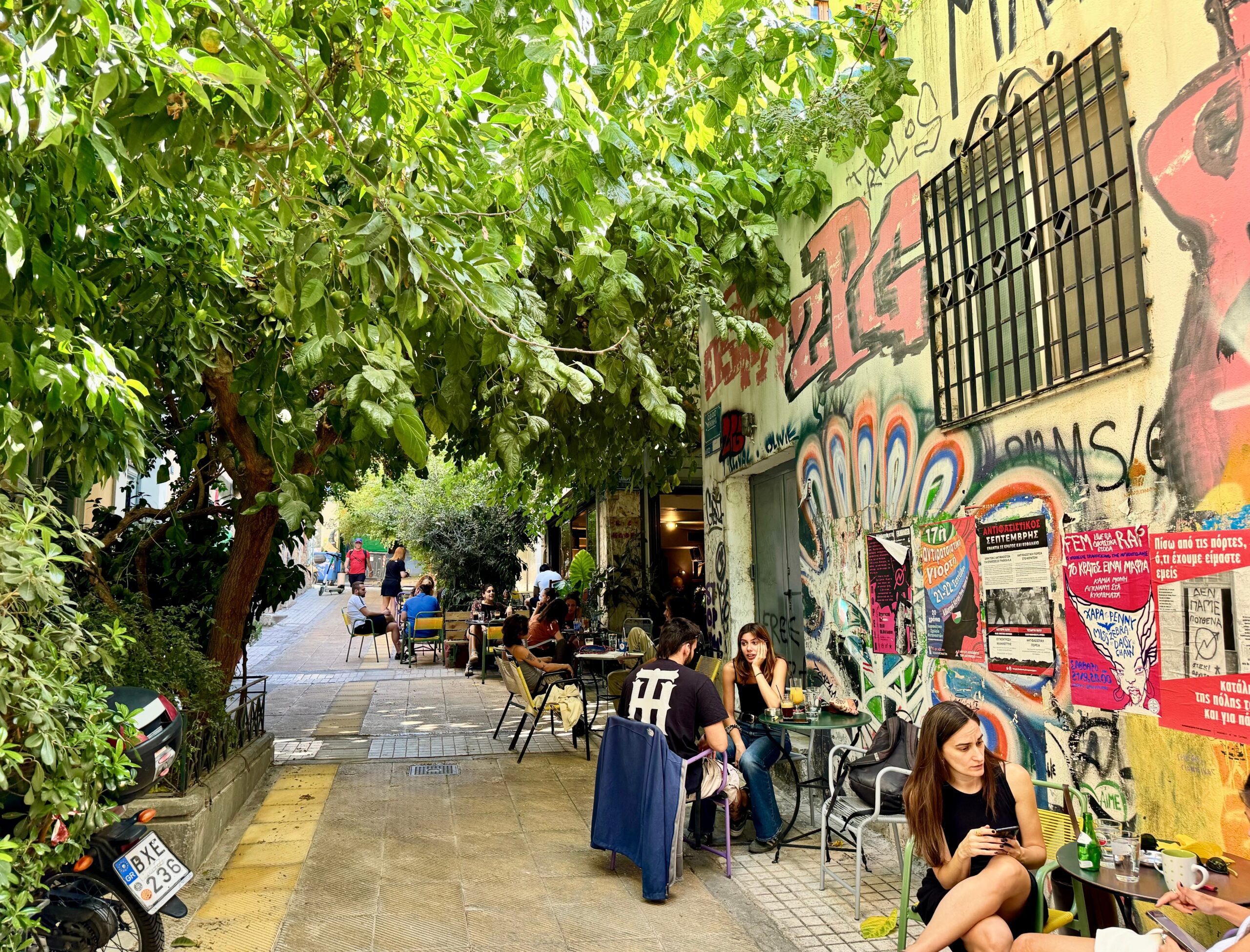 Psirri’s central area, above Athinas street, is another great place for leisurely strolls or a stop for coffee or shisha or raki and meze. There are numerous cafes, bars, and restaurants. “New Age taverna” Linou, Soumpasis & Sia serves seasonal Greek dishes anchored in Psyrri’s creative lanes. Most kids adore Little Kook, a themed dessert spot that transports them into a different reality, or Fairytale, with its evocative floral decor.