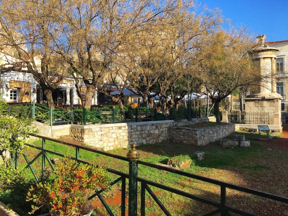 Walking from Makriyianni, you’ll soon reach Lysikrates Square, set amid charming neoclassical buildings and shaded by lush trees, offers an inviting blend of history and leisure. The centerpiece, the Lysikratous Monument, built in 334 BC, honors theatrical victories from ancient Athens. Cafes line the square, making it a popular spot to soak up the historical ambiance. If you’d like to linger here, stop for a coffee or a glass of wine and a bite at Daphne’s or at Diogenes.
