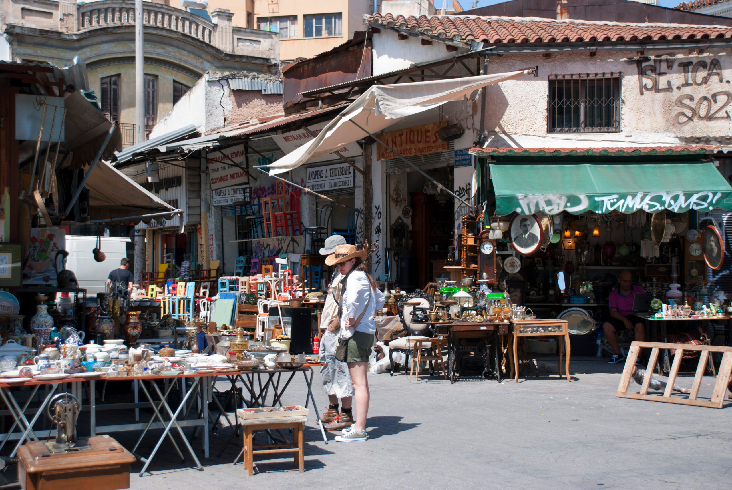 Once in Monastiraki Square, admire the views of the Acropolis from the ground or head up to 360 Bar for a coffee and panoramic vistas. Visit the Monastiraki Flea Market to check out a mishmash of Greek handmade leather goods like sandals and bags, tasteful as well as tacky tourist souvenirs, and more. If you are a fan of souvenirs and antiques, walk down Ermou from the square to Avyssinias square, where daily everything from Parisian 18th Century plates to carved Greek wooden furniture and marble busts are sold. There are also a couple of cafes to sit at here amidst the hustle and bustle.