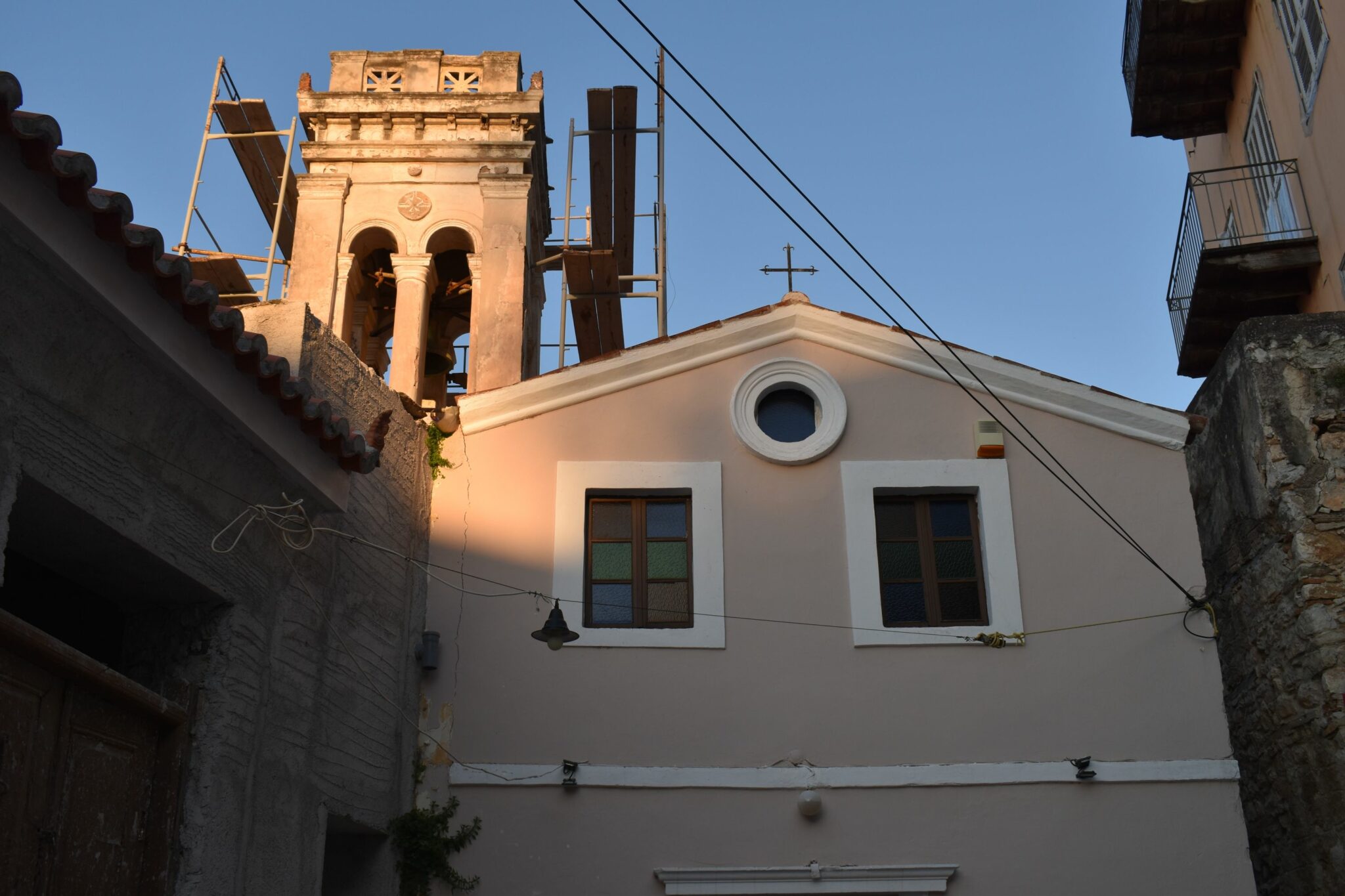 Finally, Agios Spyridonas church – where, as mentioned above, Kapodistrias, modern Greece’s first governor, was assassinated – is situated at a location where a church built by the Venetians once stood but was eventually completely destroyed. The current church, its octagonal dome a distinctive feature from above, offers a sense of peace and tranquility. The interior is painted light blue, contrasting the marble altar. A glass case on the wall, next to the entrance, covers a mark left by one of the bullets that had been intended for the governor.