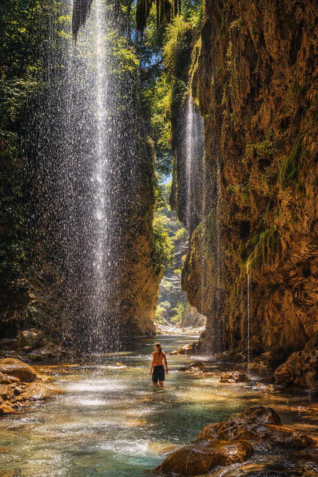 ‘Panta Vrechei’ is one of the strangest landscapes in Greece, and one of the most memorable. The gorge lies in southern Evrytania, between the villages of Roska and Doliana, and is crossed by the Krikelopotamos River in the wider landscape between Kaliakouda and Platanaki. Its name, meaning “it always rains,” comes from the water that falls continuously from springs high in the rock face and drifts down in fine threads over the river below. That is what gives the place its peculiar beauty.