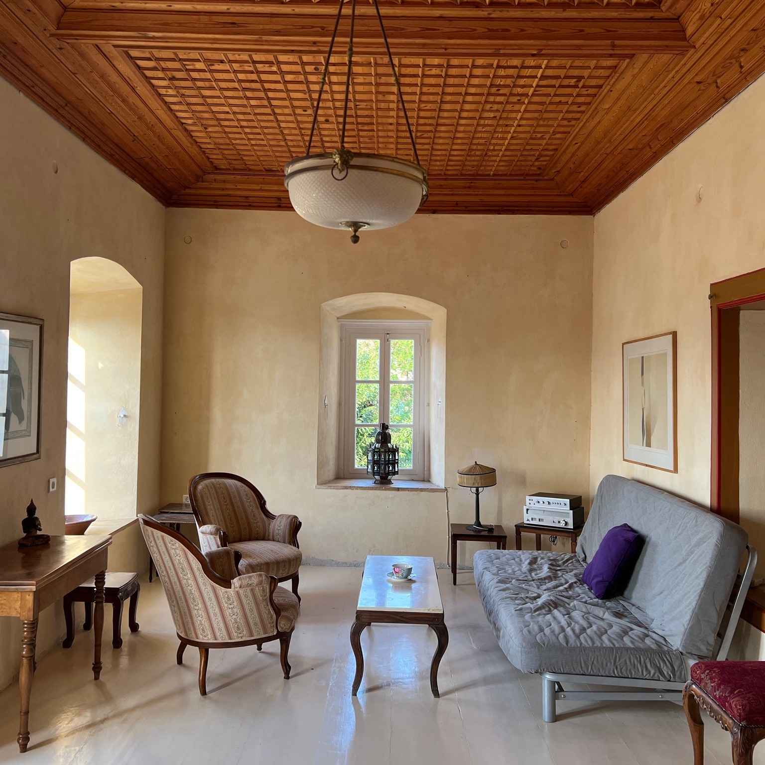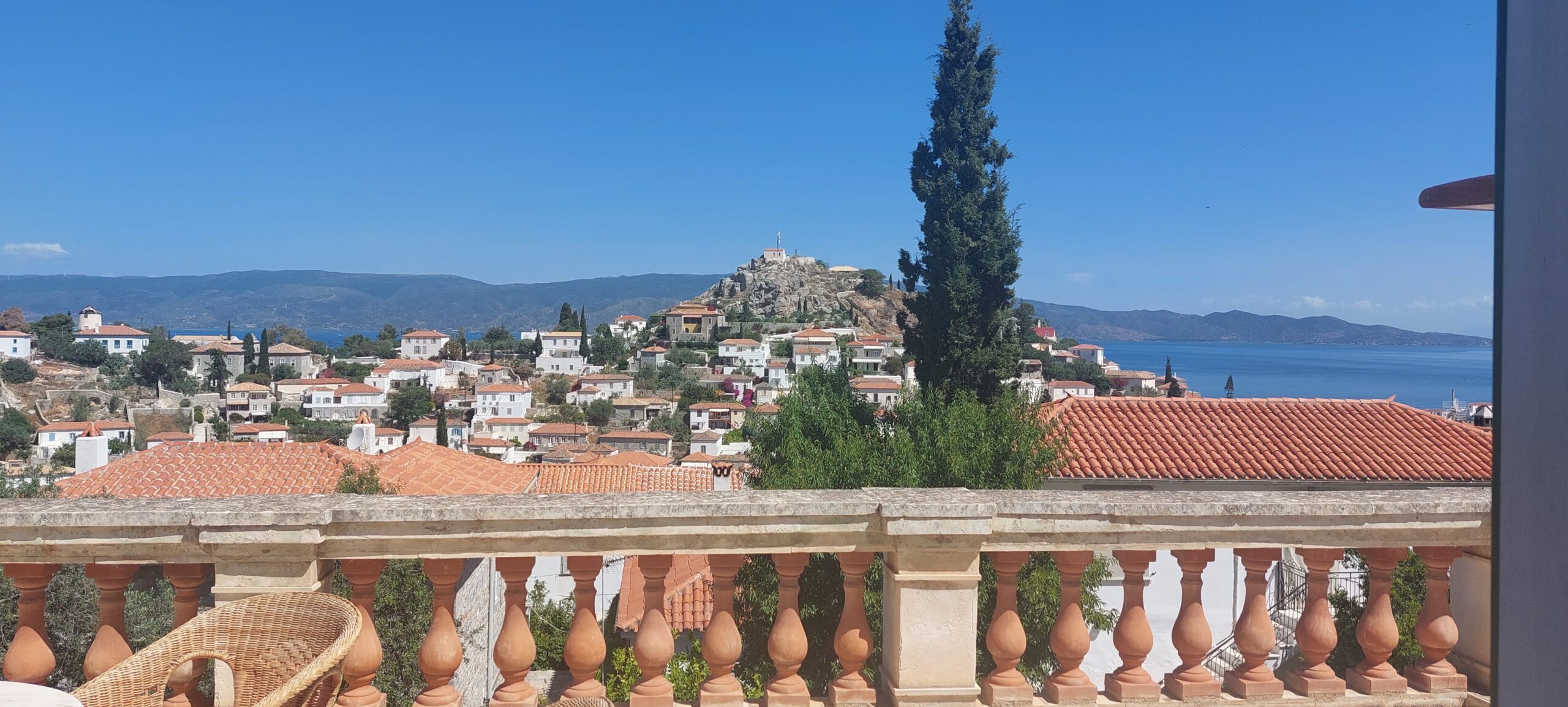 The Oikonomou House transported us to a different dimension, combining the past, present and future vision of Hyda through the effusive nature of our warm and gracious hosts. The five guestrooms are spacious and minimal, with comfortable double beds, marble floors, tasteful antique furnishings and striking decor pieces. Yoga is held in the ballroom, a large room with mat-covered floors, a gilded gold-framed floor mirror, and a sculpted wooden ceiling. Upstairs there is also the library, lined with books collected by the family and decorated with paintings, objects d’art and furnishings. It leads to the large terrace where we enjoyed ample breakfasts of local products and pastries, overlooking an arresting view of the sea, the Peloponnesian mountains, and the main town below, crowded with white houses with red ceramic-tiled roofs.