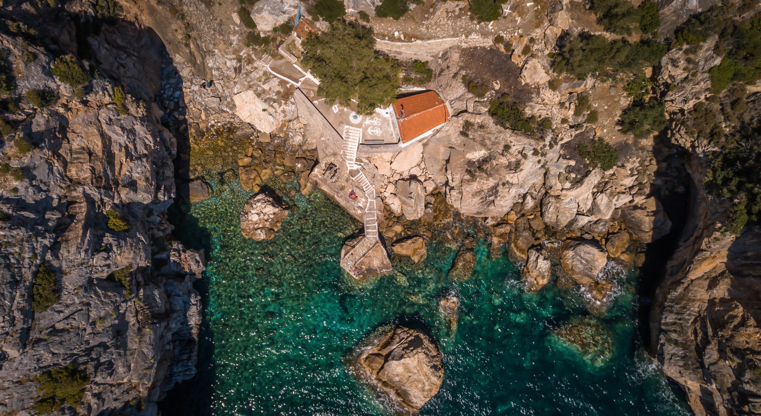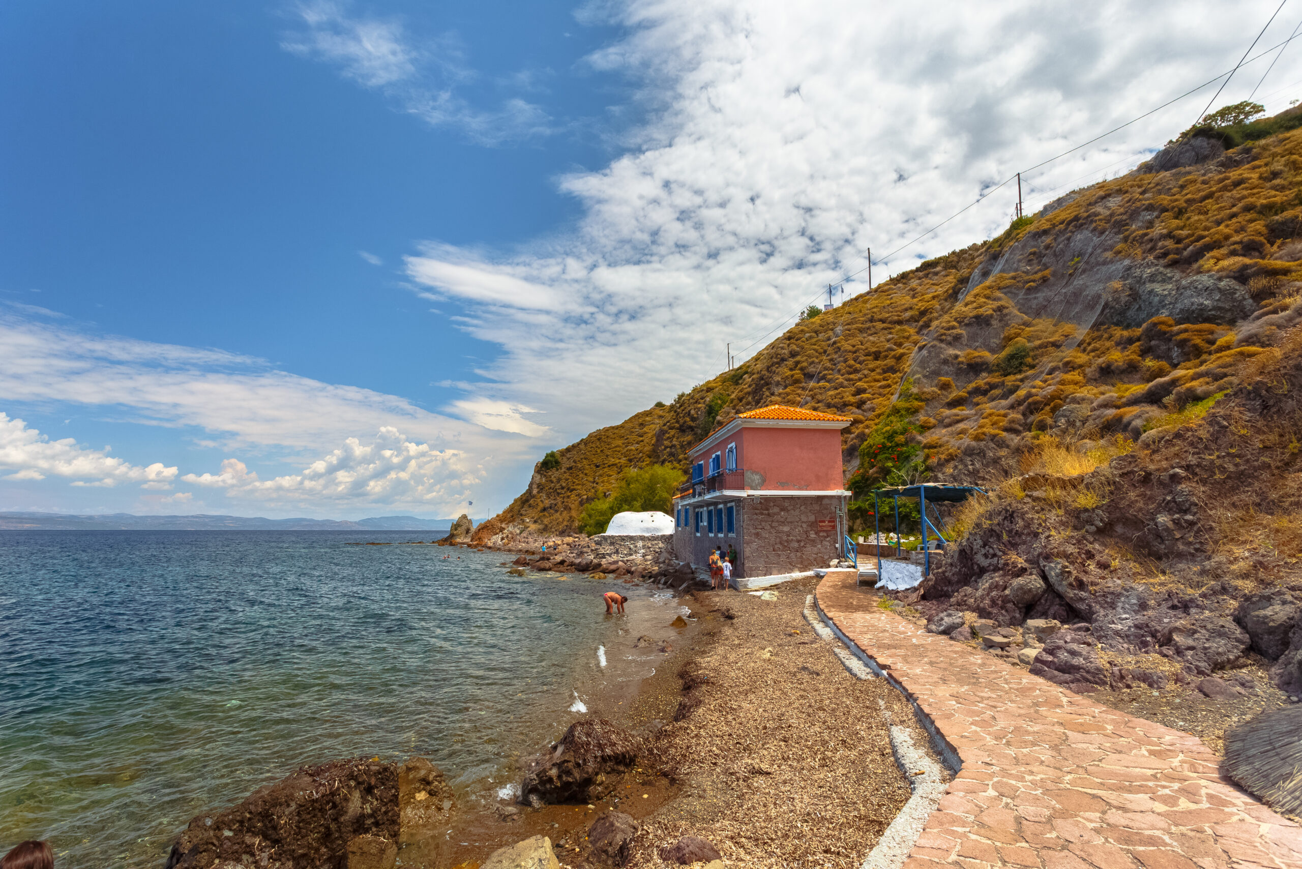 Descending towards the small church of Panagia I Kryfti (“The Hidden Mother Virgin”), you will come across a stone building containing three rooms inhabited by boats, as well as five smaller rooms that once functioned as vestries. From these rooms, stairs lead to a coast, where a crack reveals the entrance to a small cave. Inside, a little lake filled with hot water awaits. Many visitors arrive by boat, stopping several meters away and swimming or using a smaller boat to reach the shore. Alternatively, you can access the location by land, with a 57-kilometre journey from Mytilini Town and a dirt road from Melinda, the nearest settlement.