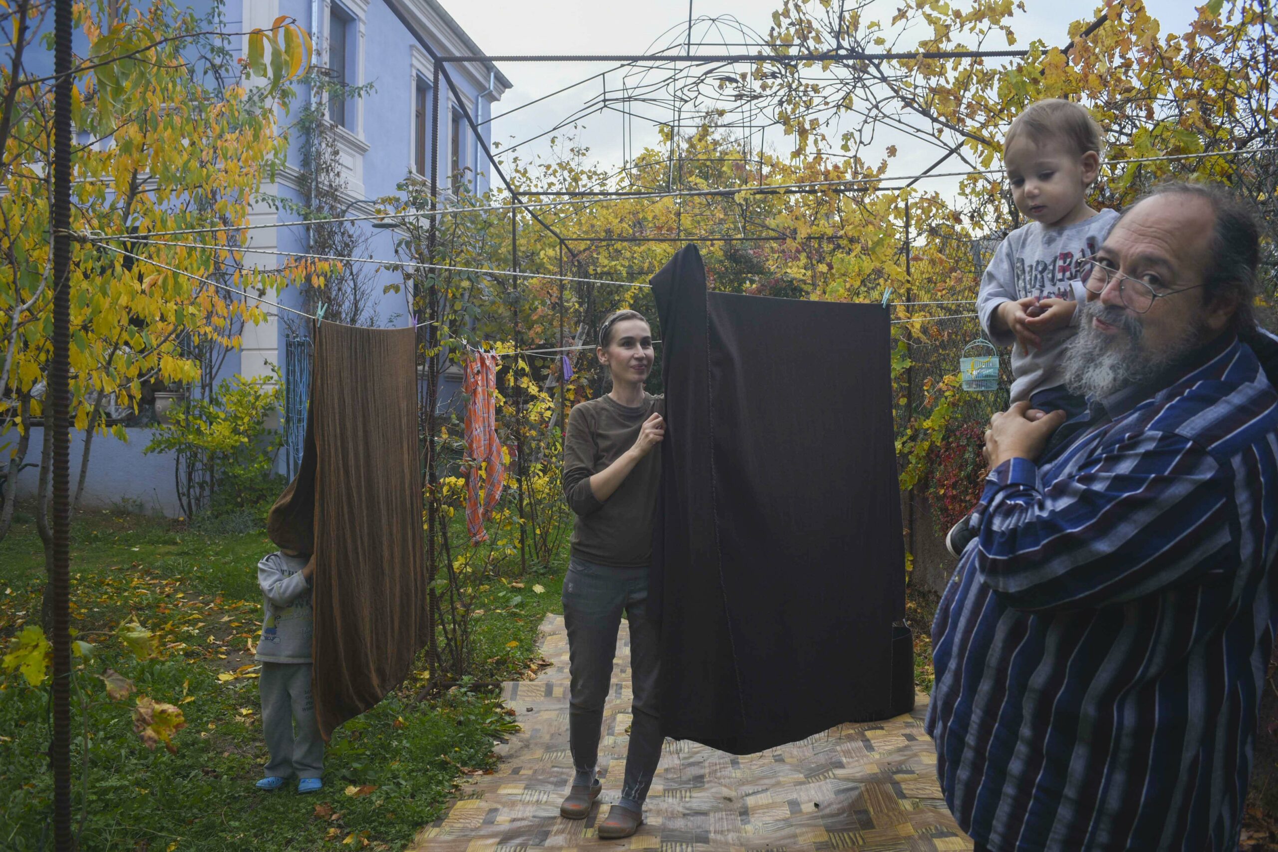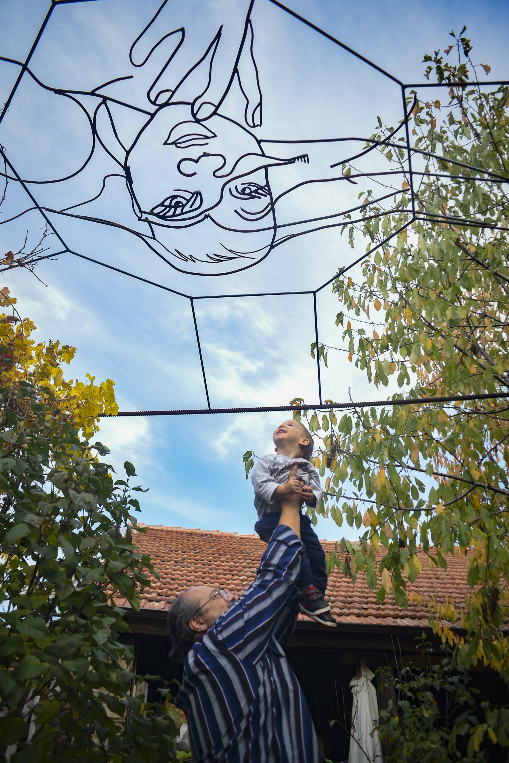 Haris is carrying his youngest son, two-year-old Myronas, on his shoulders. They are playing hide and seek behind the laundry that Magda is hanging. The artists, young and old, stand next to their works. Looking up, at the blue sky, I see the portraits of the mother and her sons made in metal outlines by Haris on the pergola: an elaborate ceiling against the sky.