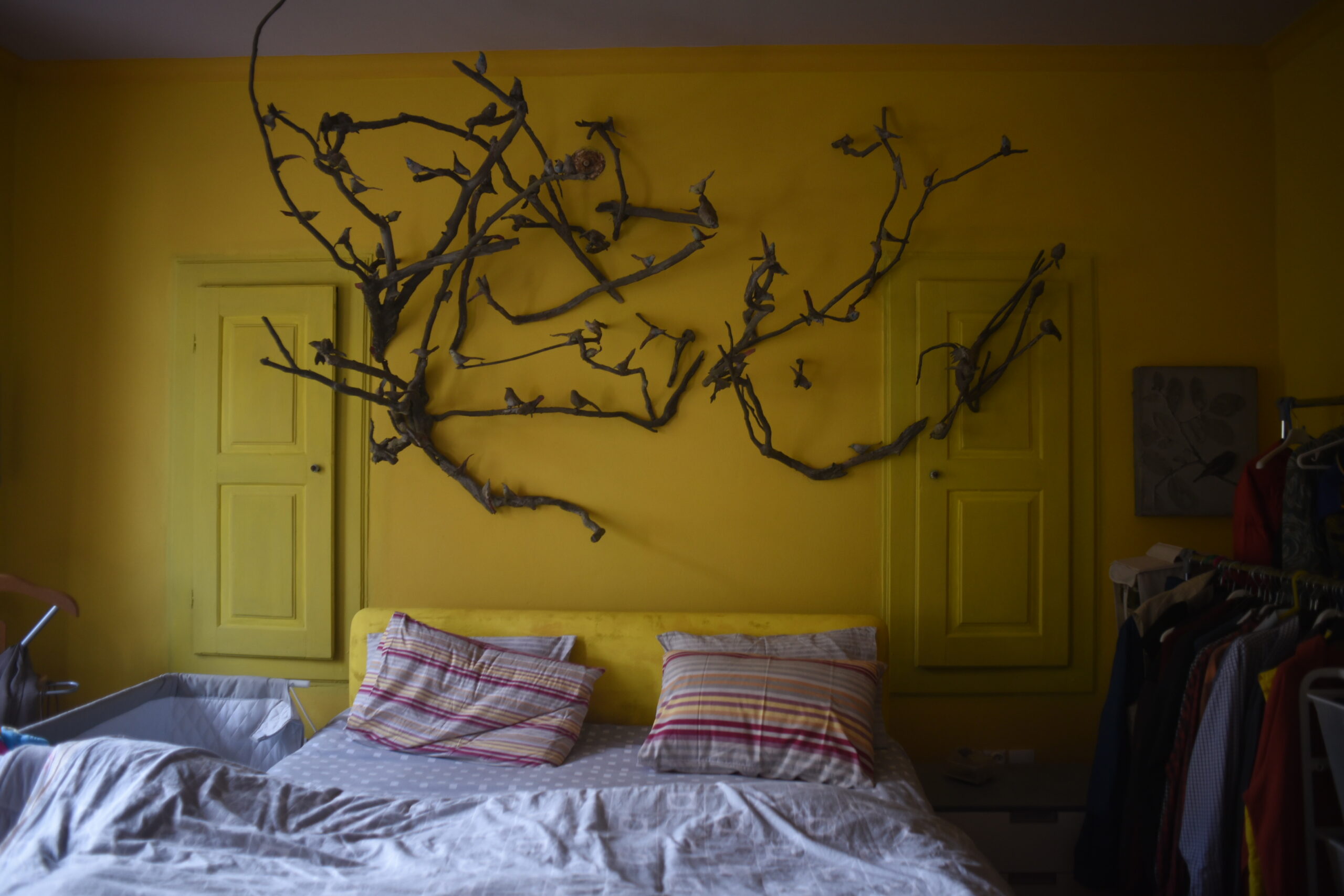 The “Suicide Authors”, a collective period portrait made by Magda has been placed across the couple’s sunny bed. They are in conversation with Haris’ birds that hang over the bed. “Branches, cardboard, Styrofoam, and feathers from the neighbour’s chickens are the materials I used,” he tells us.