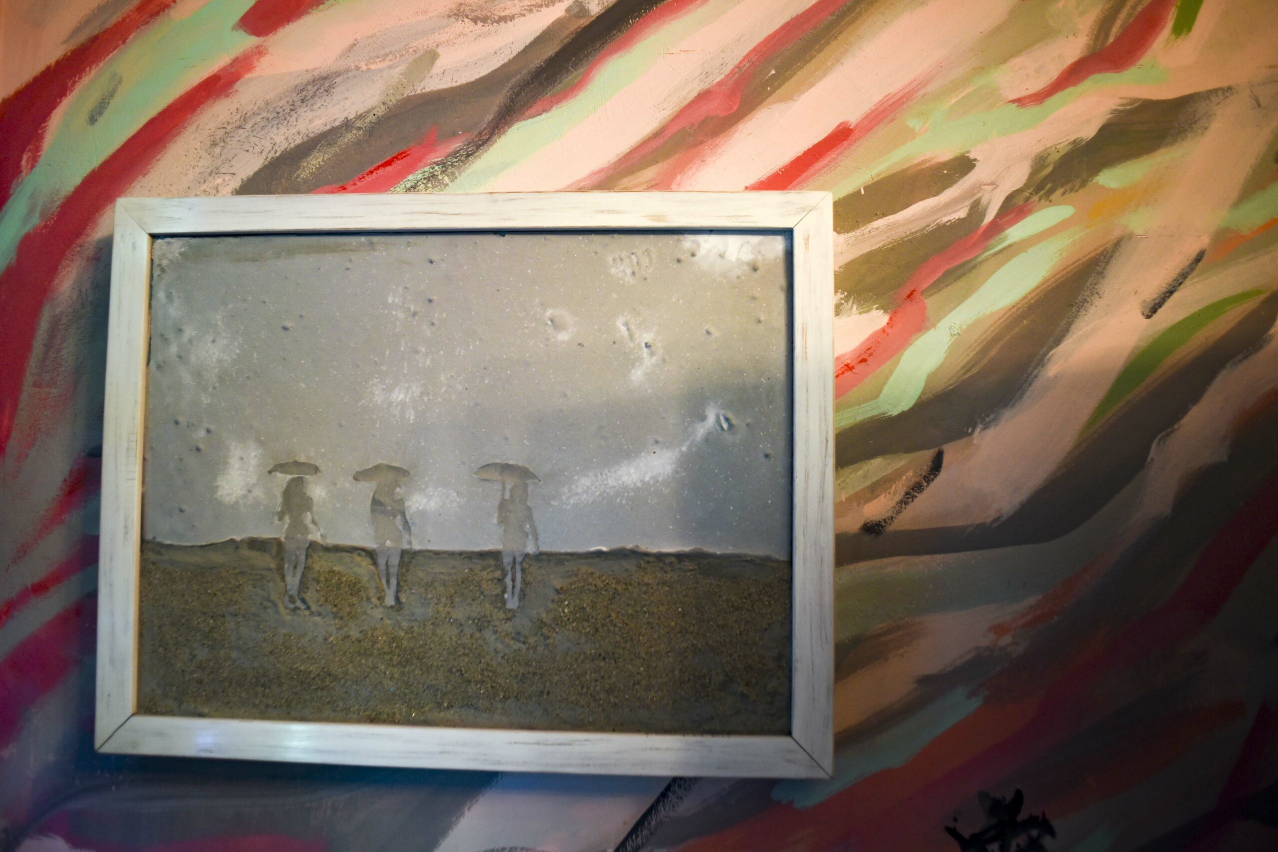 We go upstairs using the lovely staircase. Wooden steps, over a 100-years-old, creaking and creating nostalgic cinematic images, that the paintings and the objects complement. Woodworm and neglect had damaged the wood, so, Haris restored and painted the steps. 30-year-old works, from the studies on concrete (like the architectural boxes) and the three-dimensional creations made with colourful concrete that are a commentary on the refugee crisis to the stories about shipwrecked watermelons.