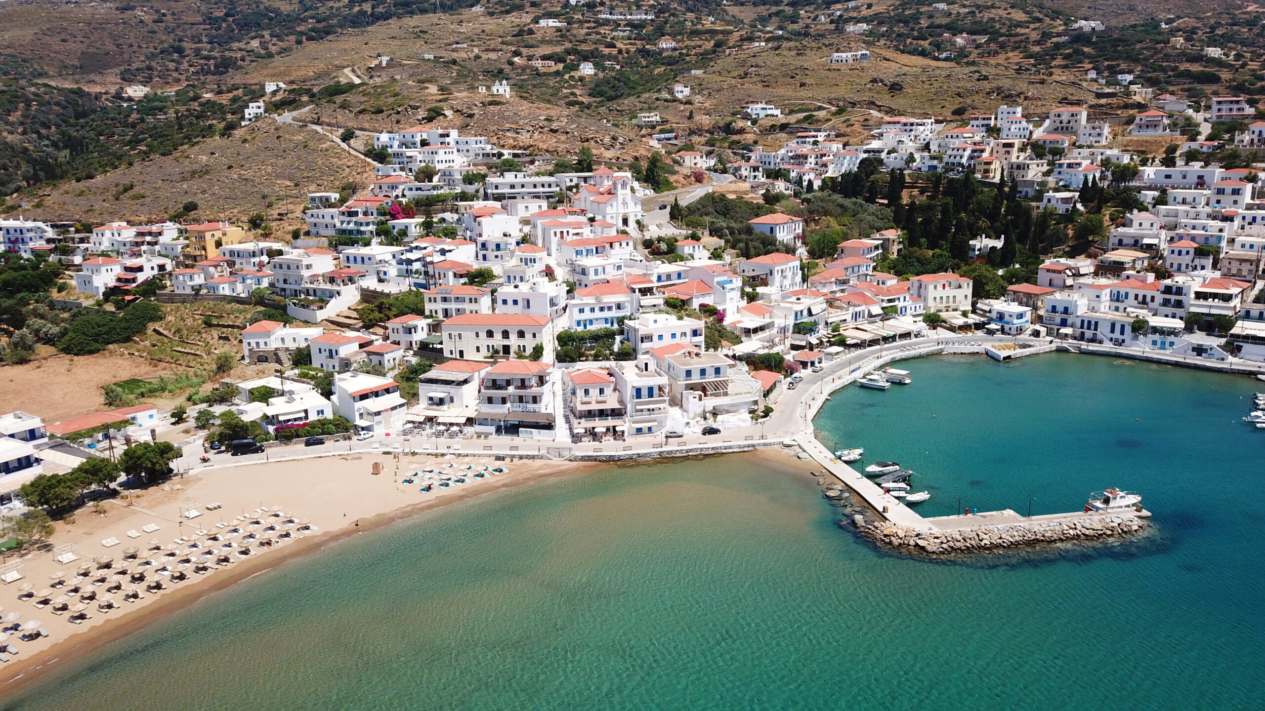 Agios Petros: Andros’ biggest beach, Agios Petros is sandy with shallow waters, making it a favourite spot for families. It is serviced. Water sports are offered.