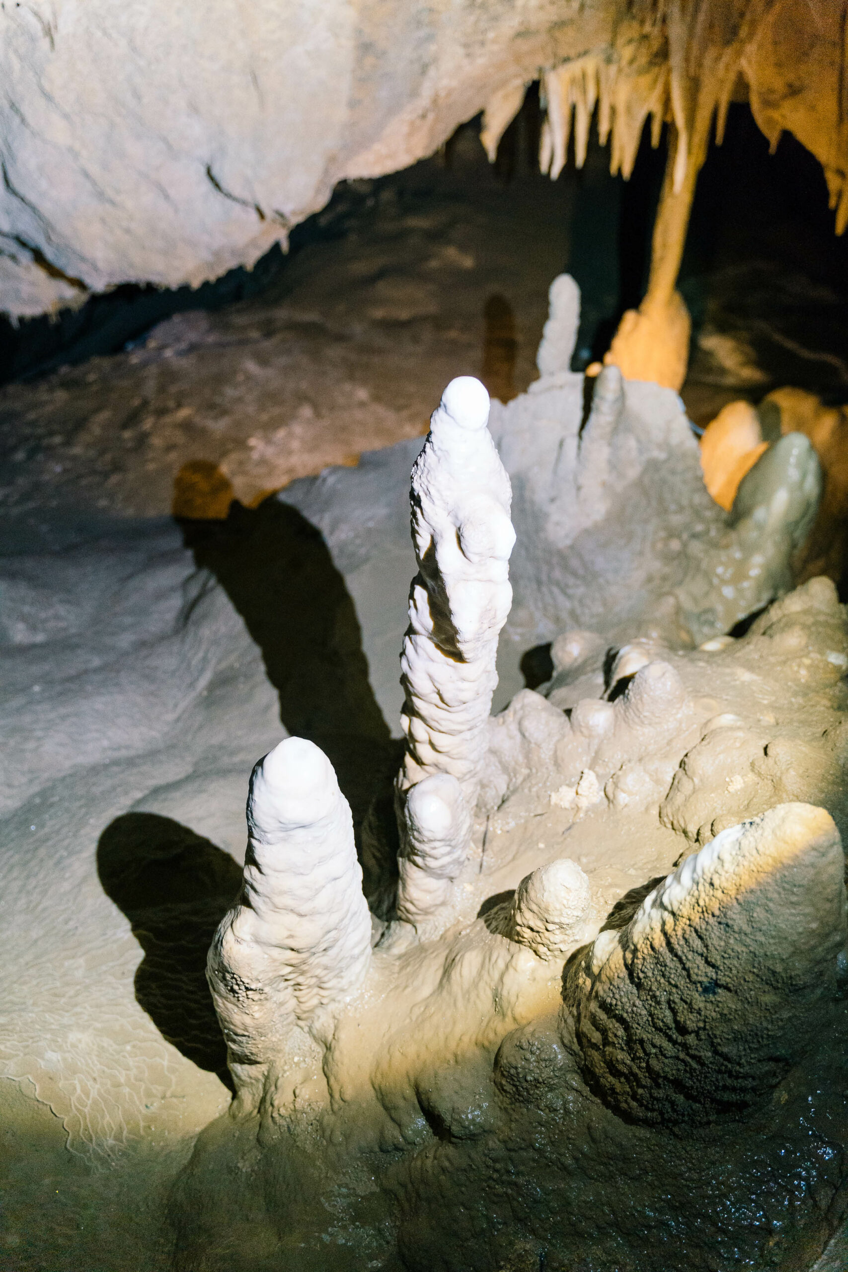 The double staircase behind a row of stalagmites hides the White Lake room. Nearly 52 metres of colourful geological formations give the Route of Wealth its name. The Pink Lake chamber is filled with tiered lithic basins that receive the running waters of the lake. The rocks are reflected in the water and the colour changes endlessly. Boulders, stalactites, and rocks smoothed for millions of years by the waters complete the picture. In the final, very steep part of the cave the roar of the river flow is captivating. The return is back the same way but the eye constantly captures new details; it is like walking through a whole different cave.