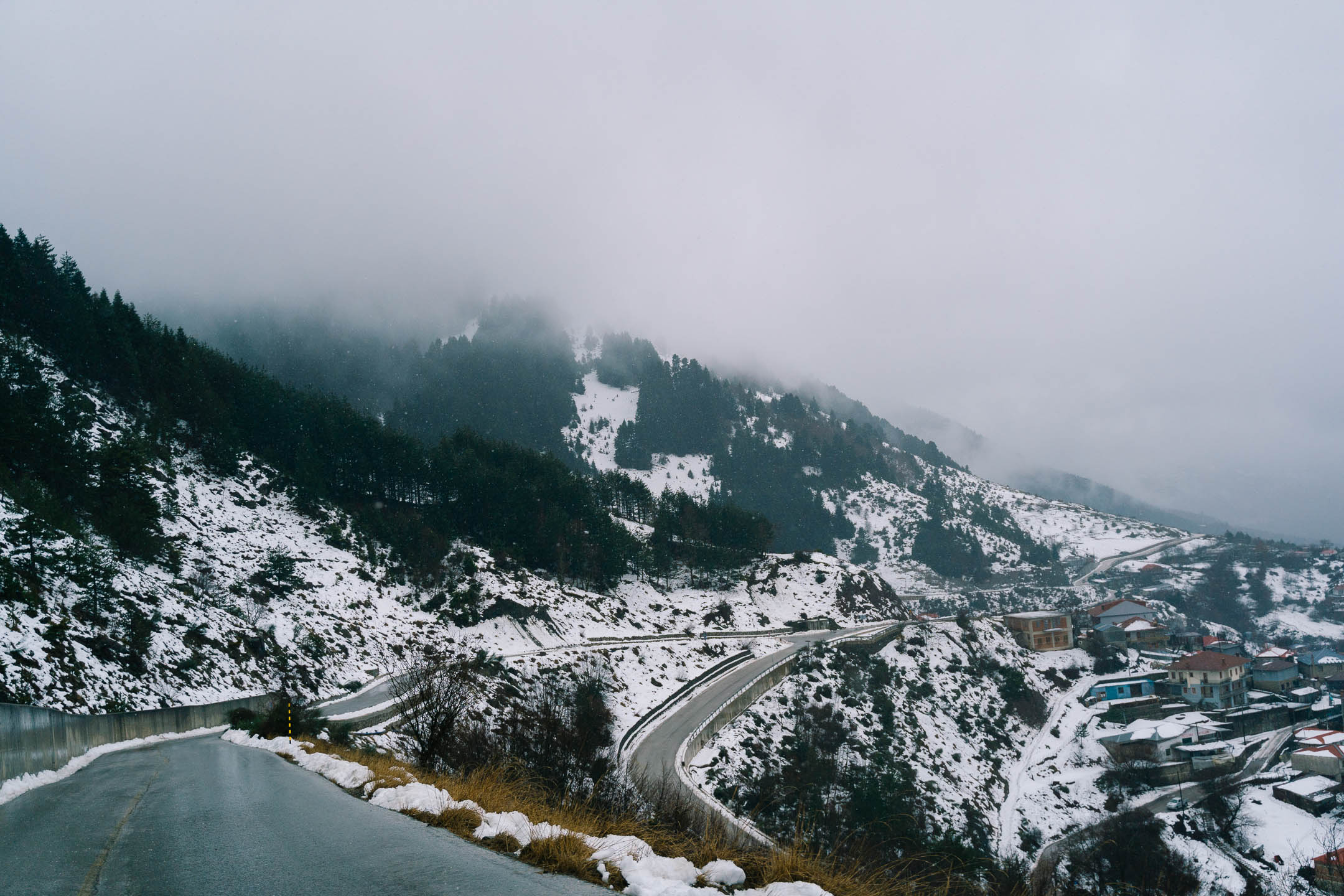 The temperature is around 0 °C and it’s softly snowing. We discuss leaving the tour of Metsovo for later and going to the Anilio ski resort so that we can experience the snow, and we’re on our way. It’s a short distance, but it becomes an enjoyable excursion in the snow and in nature. As we go further uphill the snowfall gets heavier.