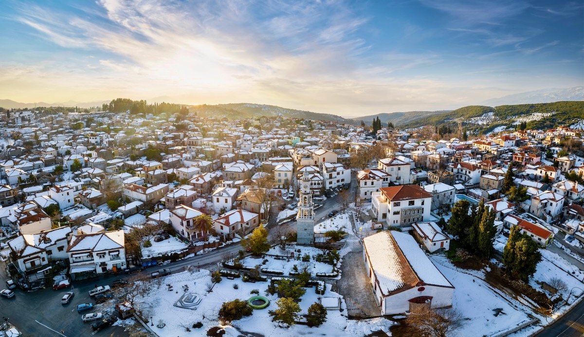 Set around 600 meters above sea level with views sweeping over the Pagasetic Gulf, Agios Georgios Nilias offers a quieter holiday atmosphere than the more visited Pelion villages. Wrapped in deep greenery — chestnut, apple, walnut, cherry, pear, olive, and beech trees — it’s an ideal setting for a Christmas break focused on warmth and rest rather than crowds.