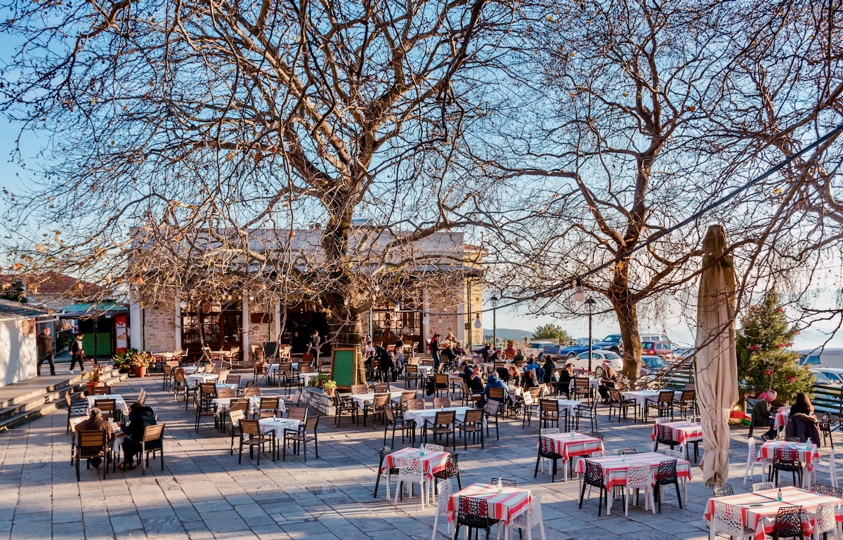 The cobbled lanes reveal glimpses of the sea along with elegant nineteenth-century neoclassical homes, classic Pelion mansions with projecting “sachnisi” windows, and stone fountains adorned with lion heads. In the main square, tavernas set out tables beneath the plane trees whenever the weather allows. At the edge of the village, the fourteenth-century Monastery of the Archangels rises like a small fortress, offering panoramic views over the gulf.